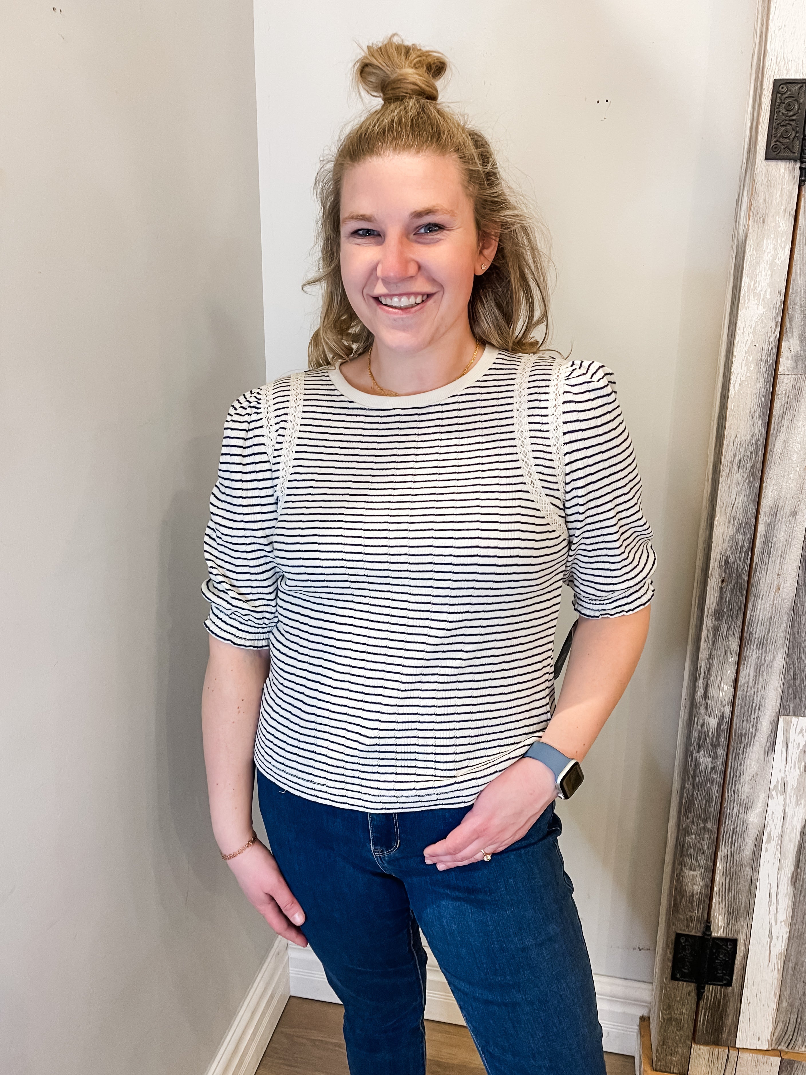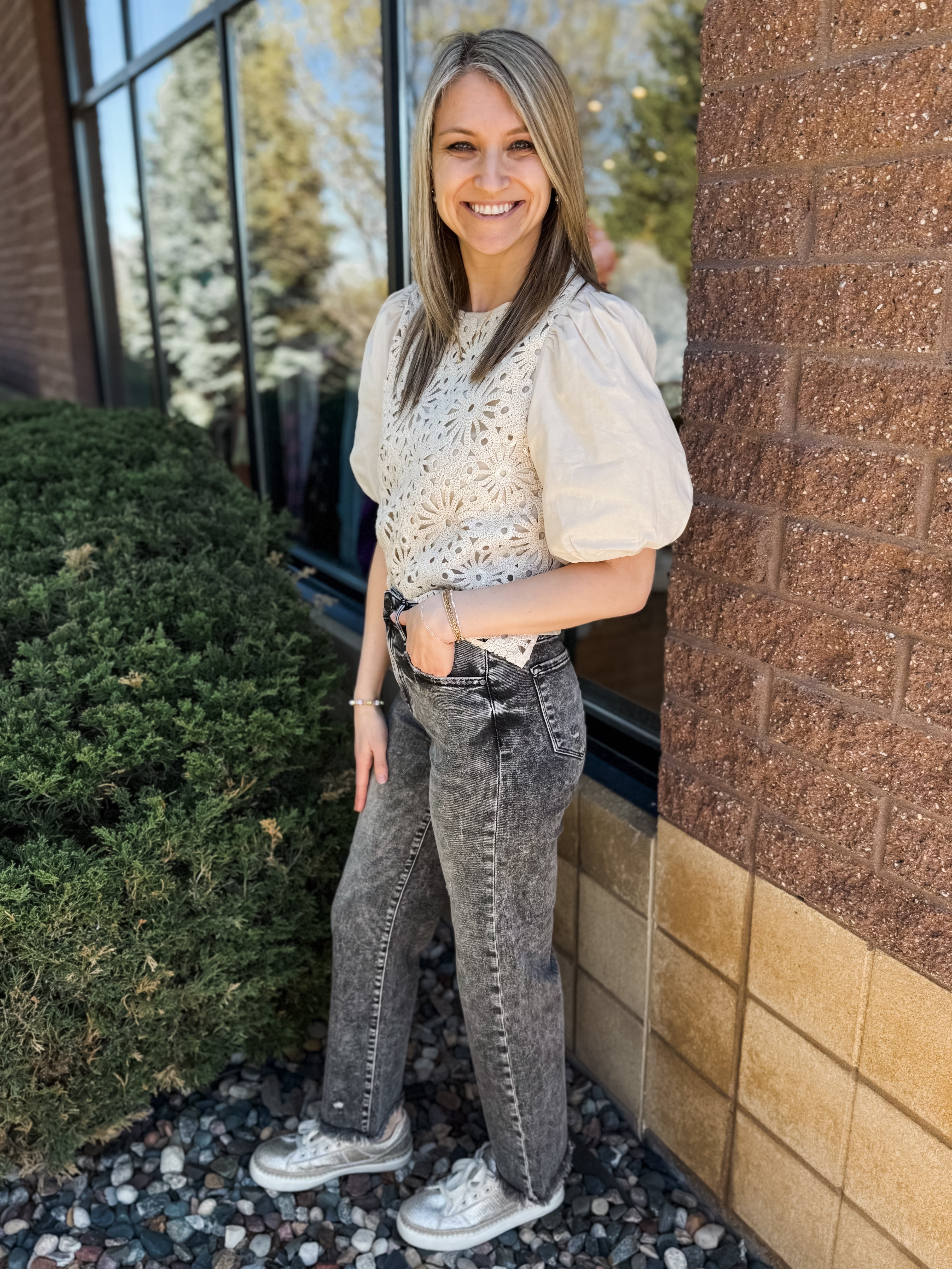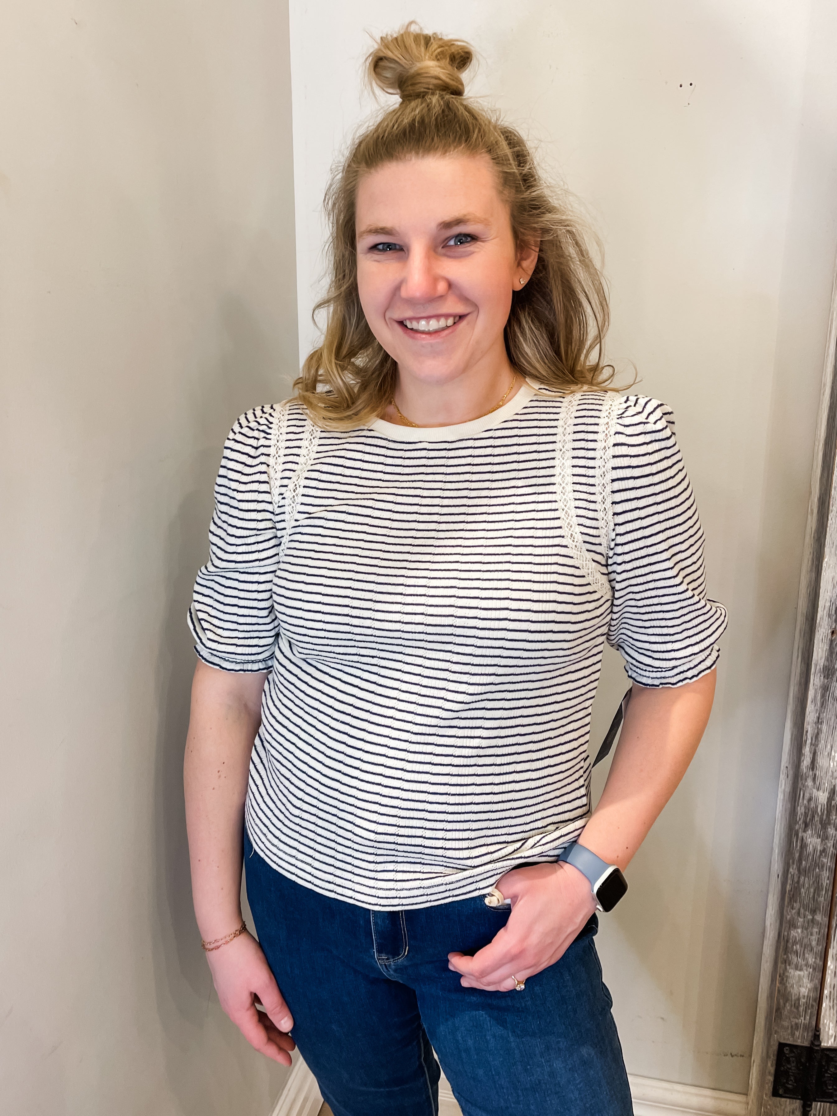 ELBOW PUFF SLEEVE, CREW NECK KNIT TOP W/ CROCHET FAGOTTING