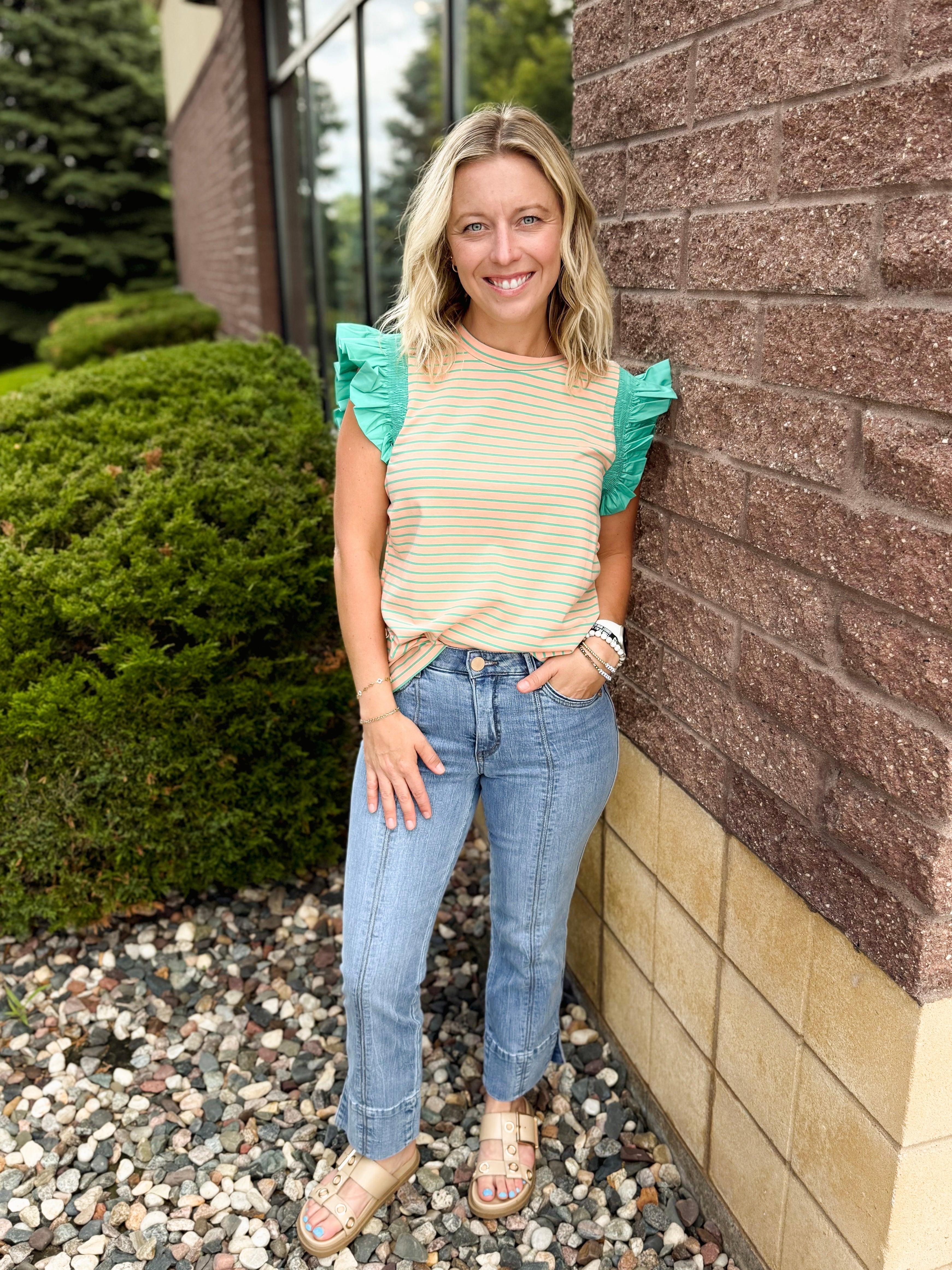 Mix Media Ruffle Sleeve Striped Knit Top