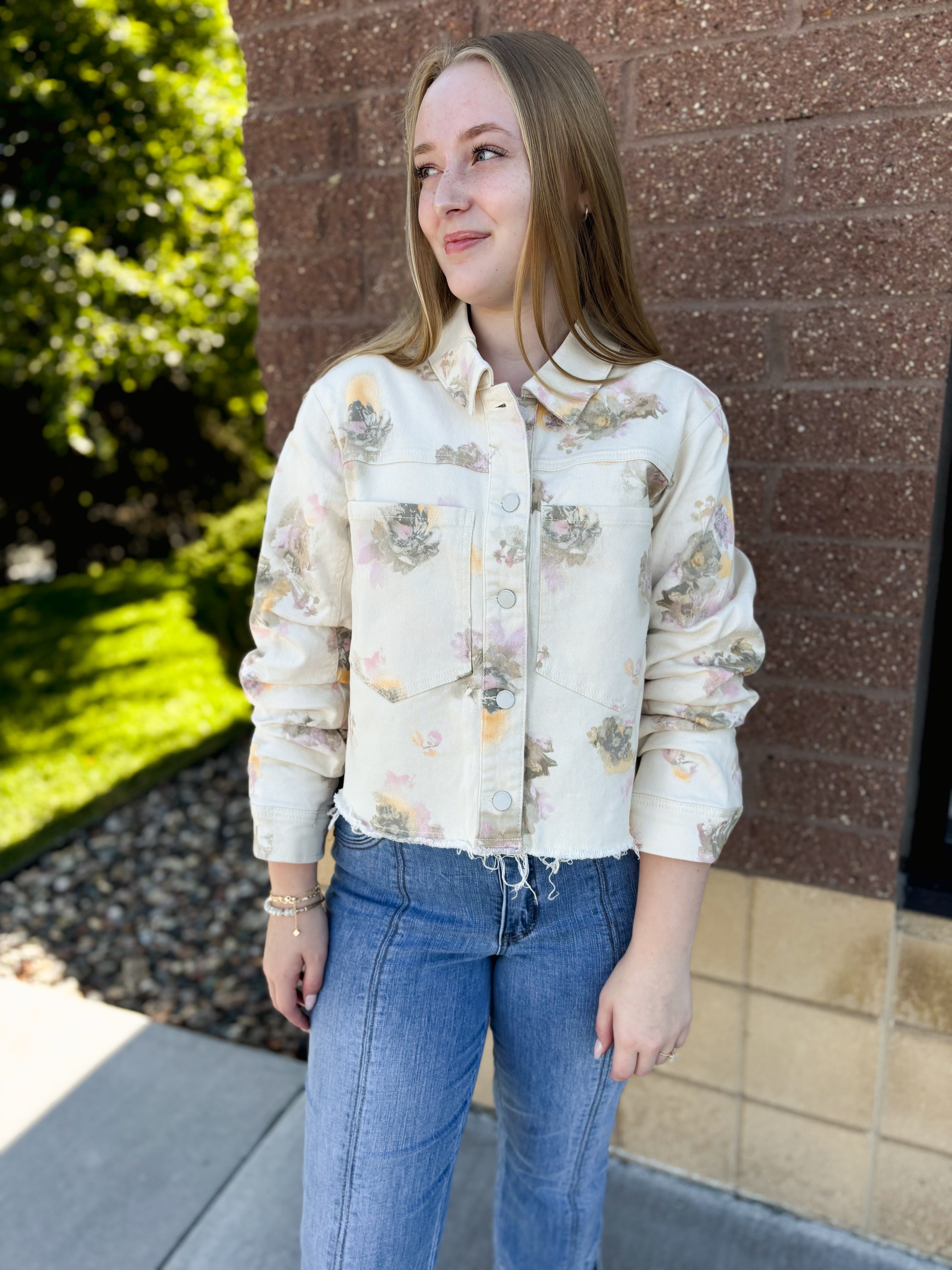 3/4” RUCHED SLV OVERSIZED PKT BTN FRNT JACKET W/CURVED RAW HEM