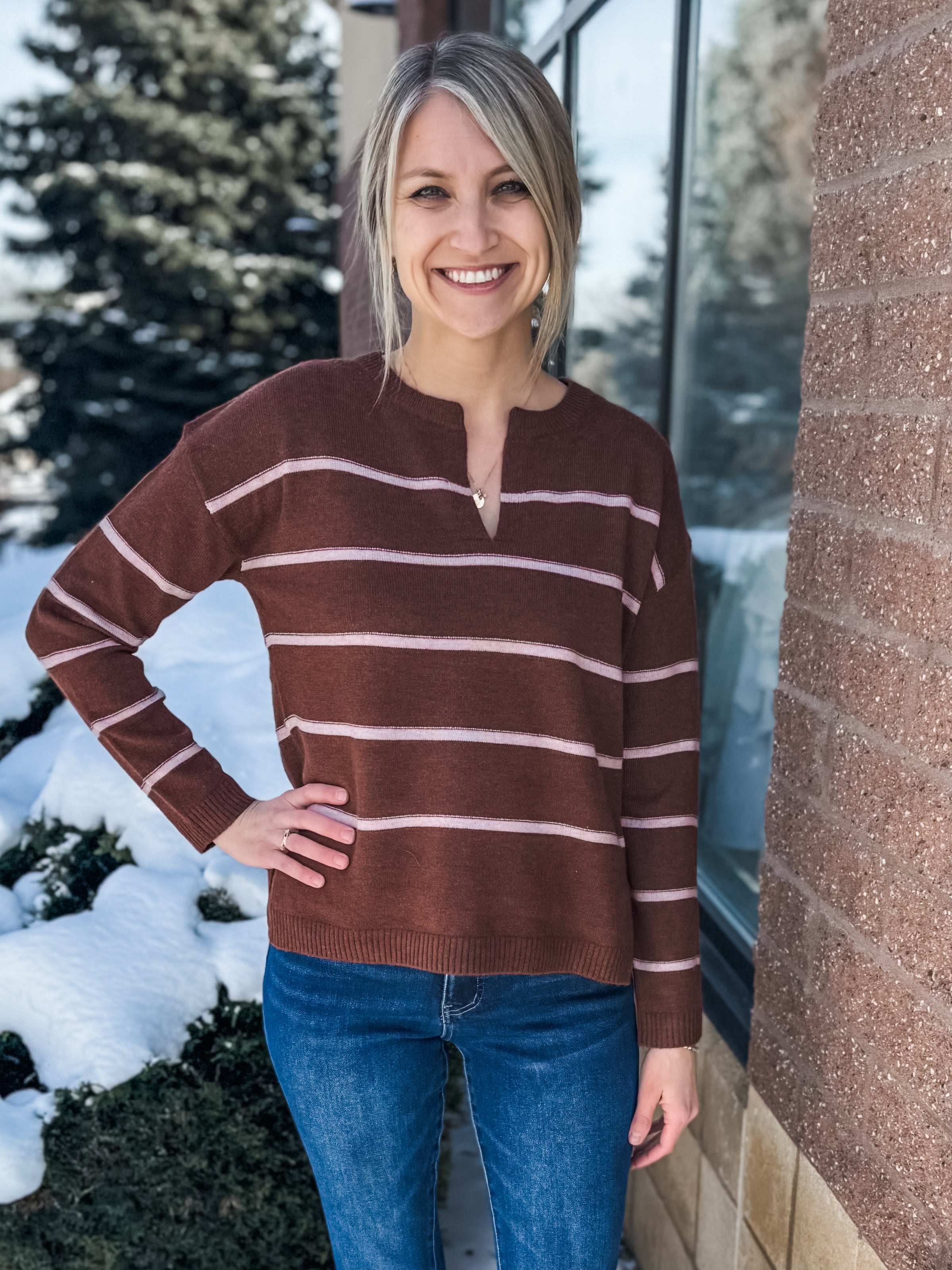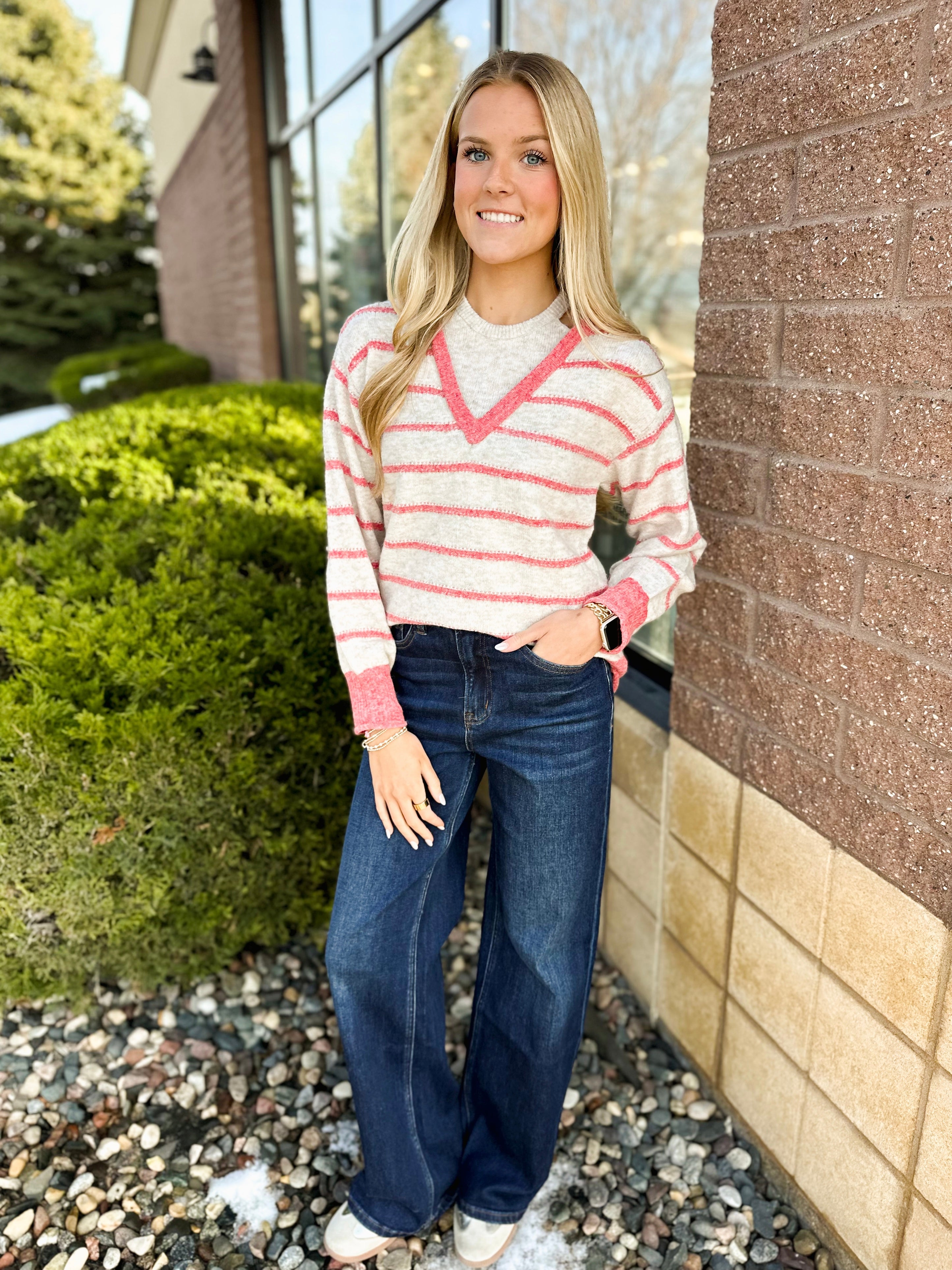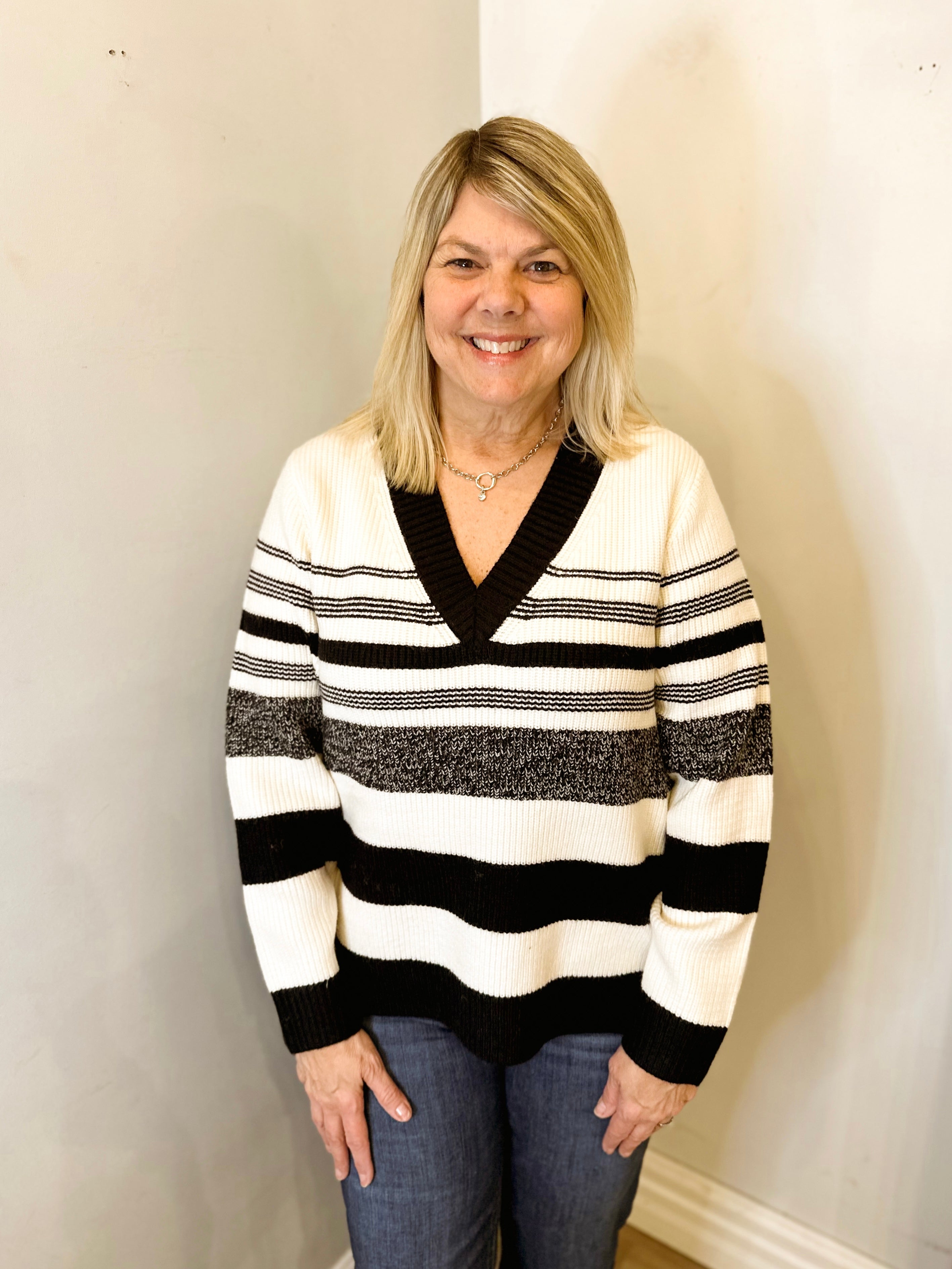 Long Sleeve V-Neck 2-Fer Sweater with Novelty Stitch Stripe and Banded Bottom