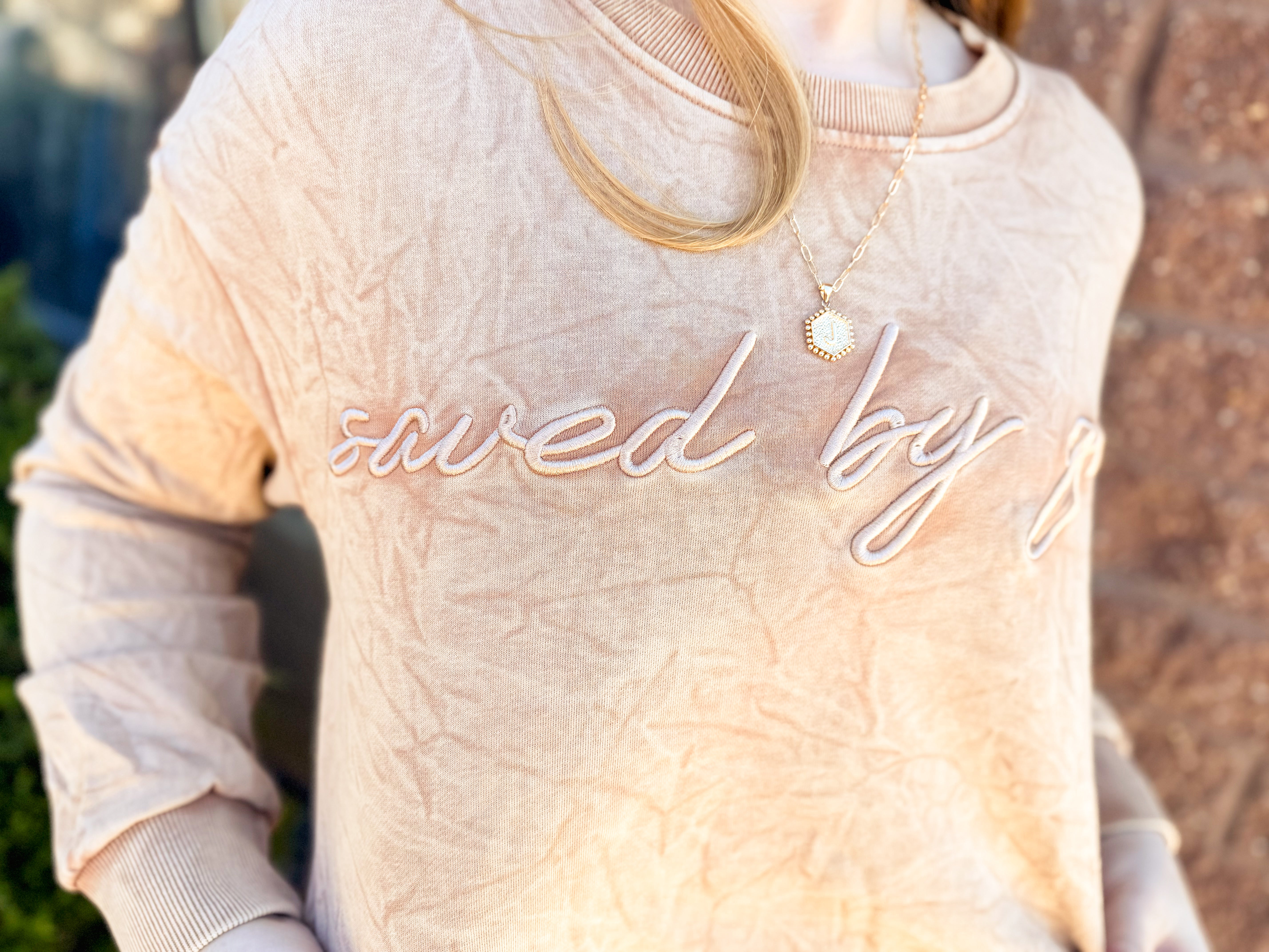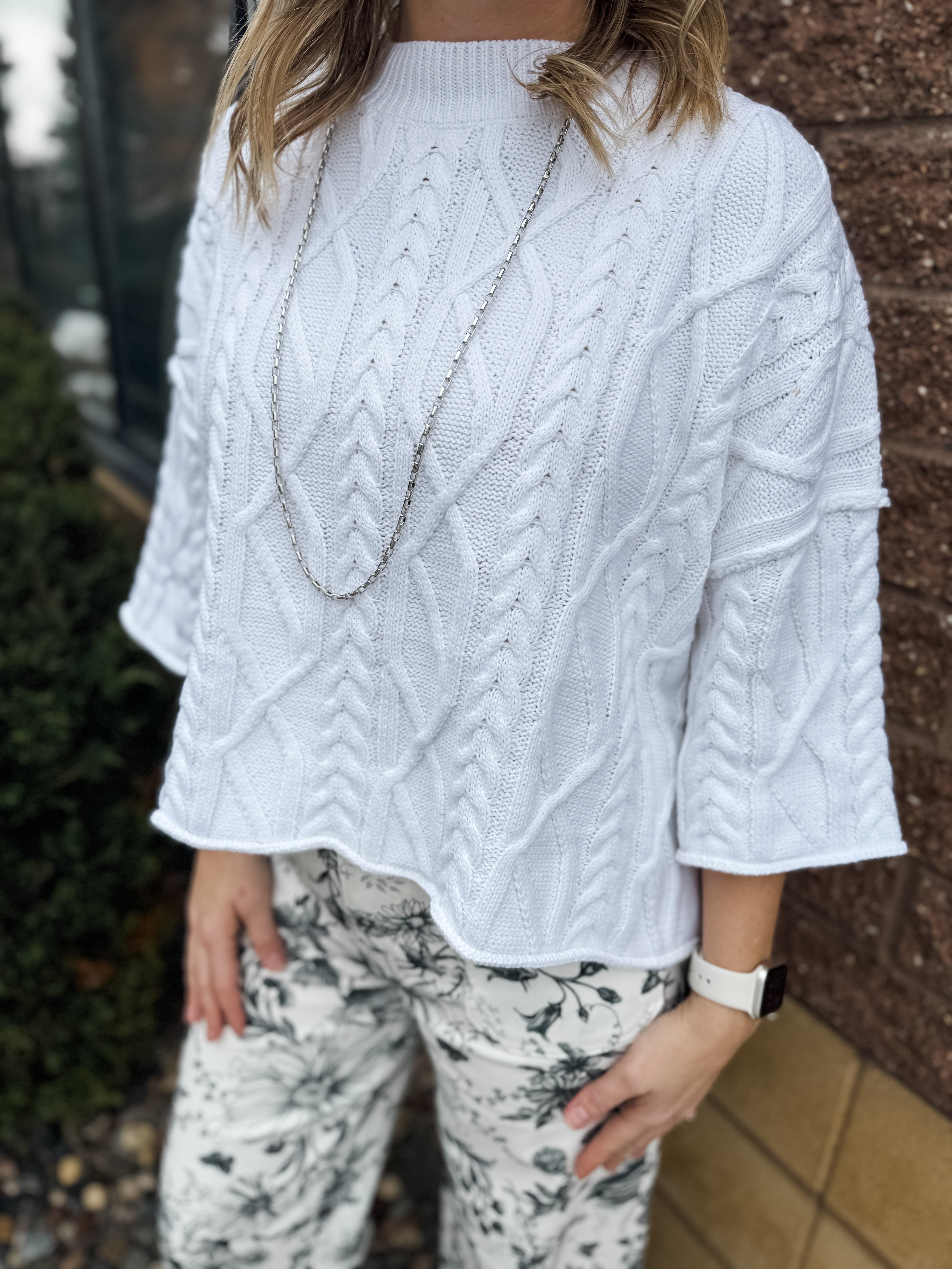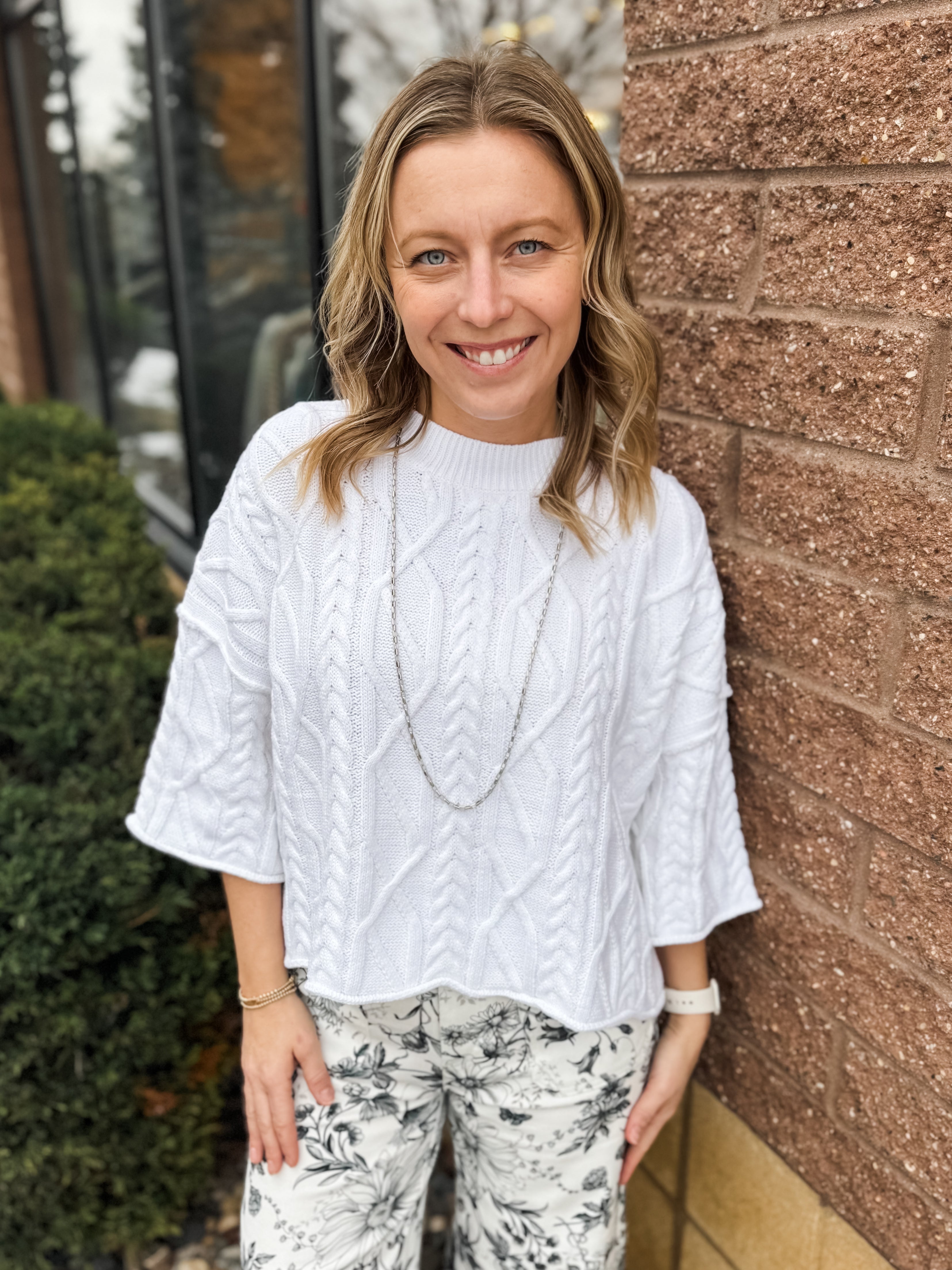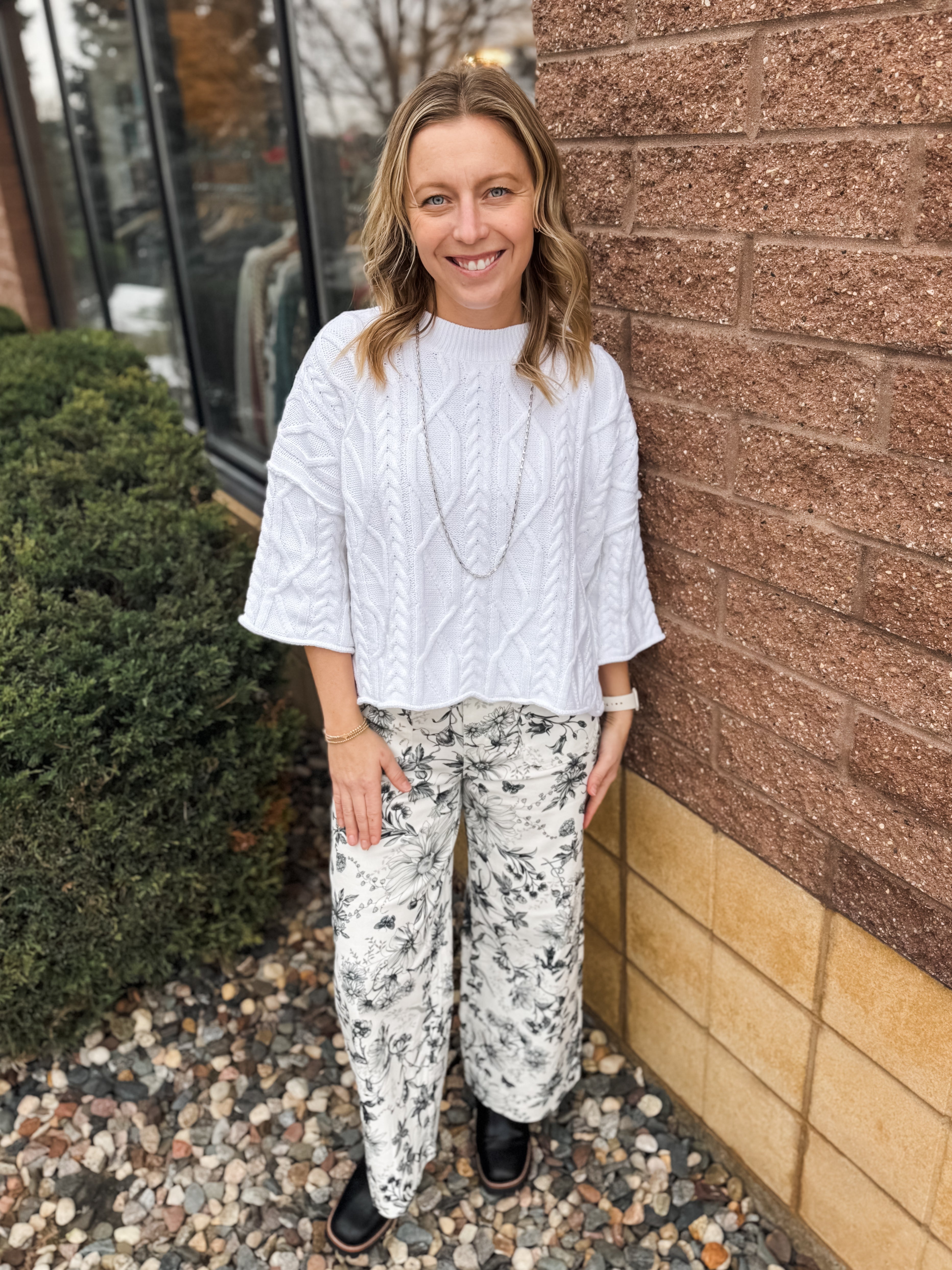 3/4 Dolman Blouson Sleeve Printed Sweater Top with Pleat Detail, Round Neck, and Banded Bottom