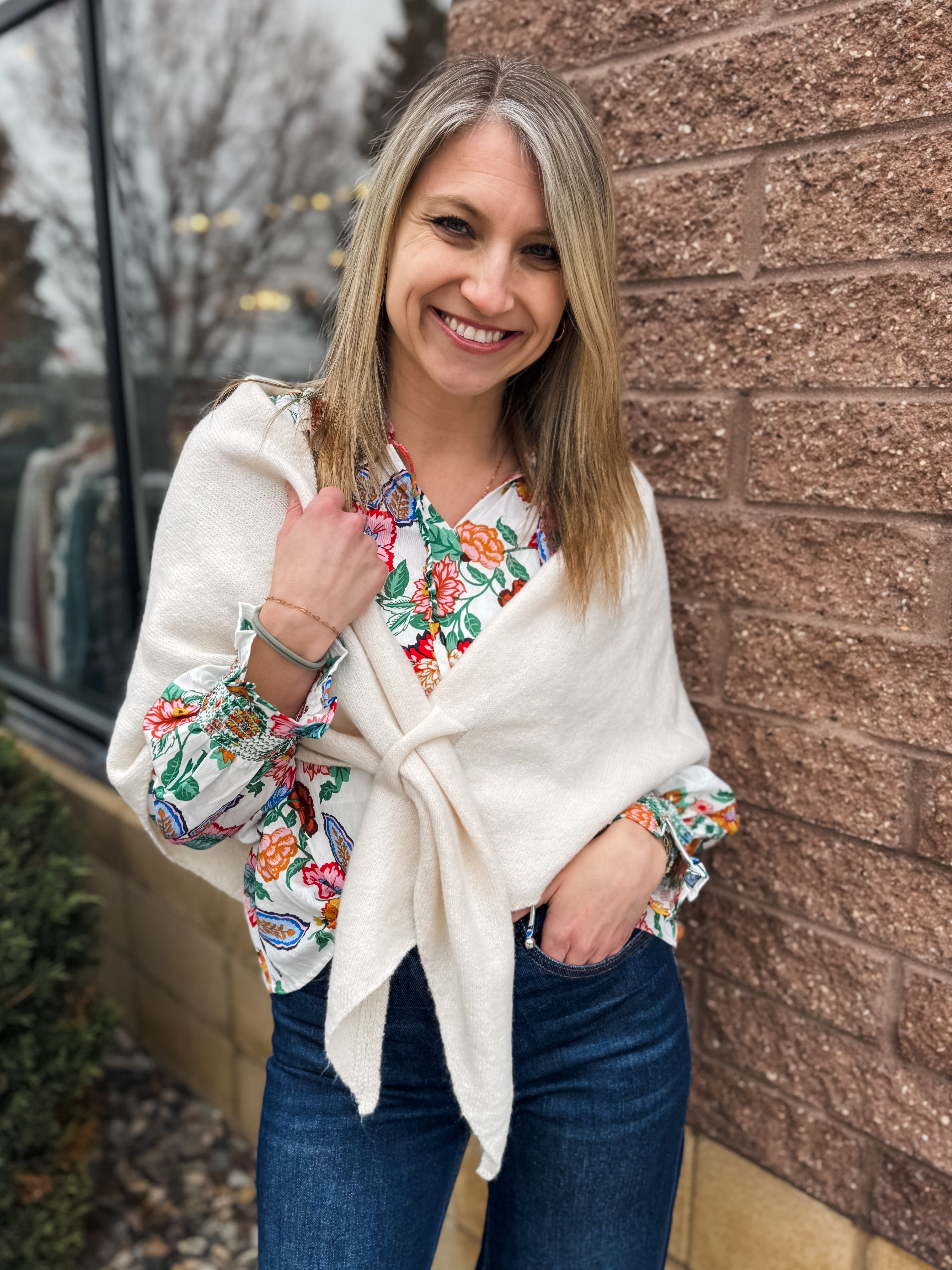 Fuzzy Cardigan With Marble Button & Blanket Stitch