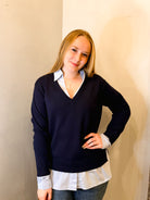 Layered Look V-neck Mixed Media Sweater