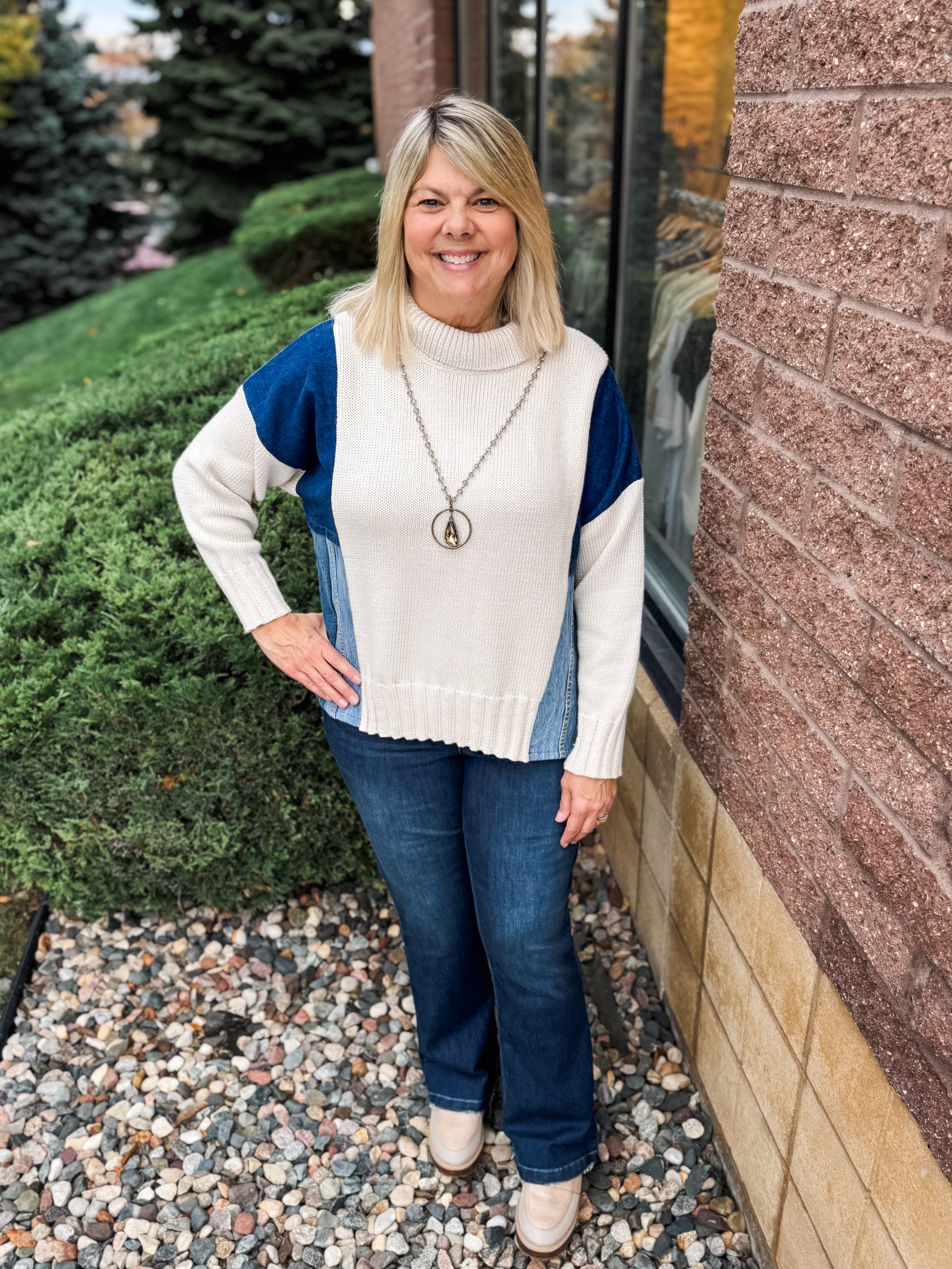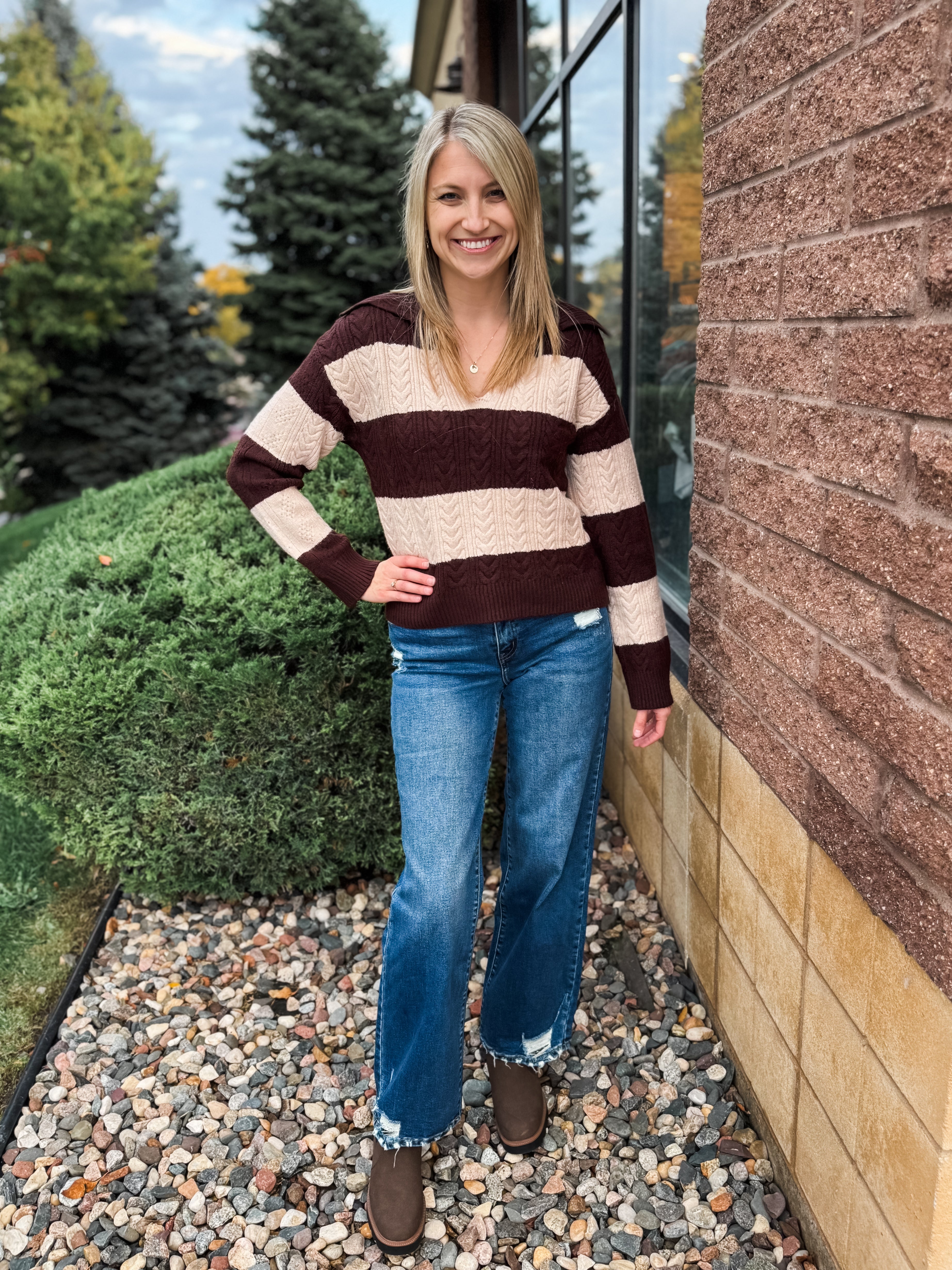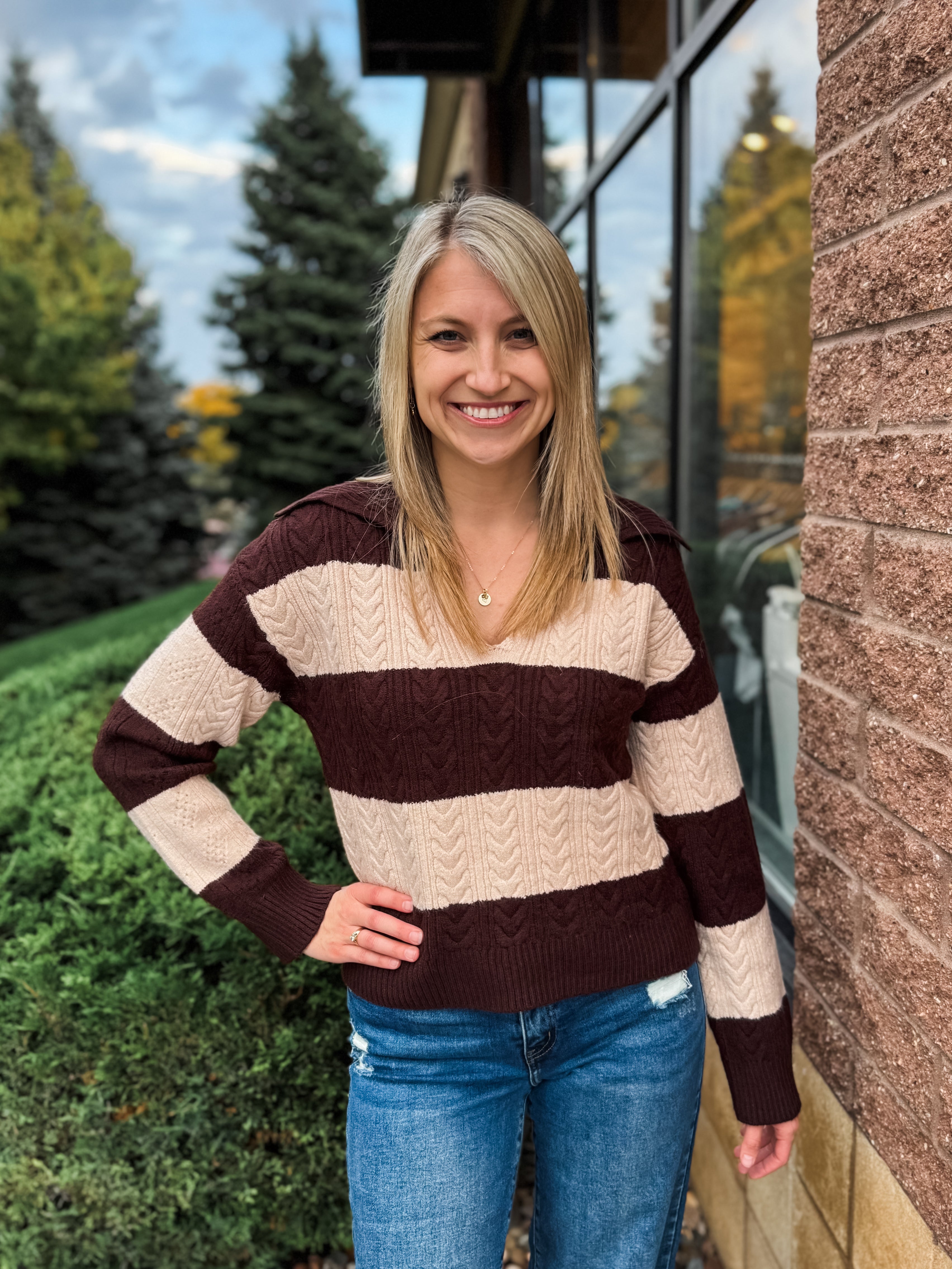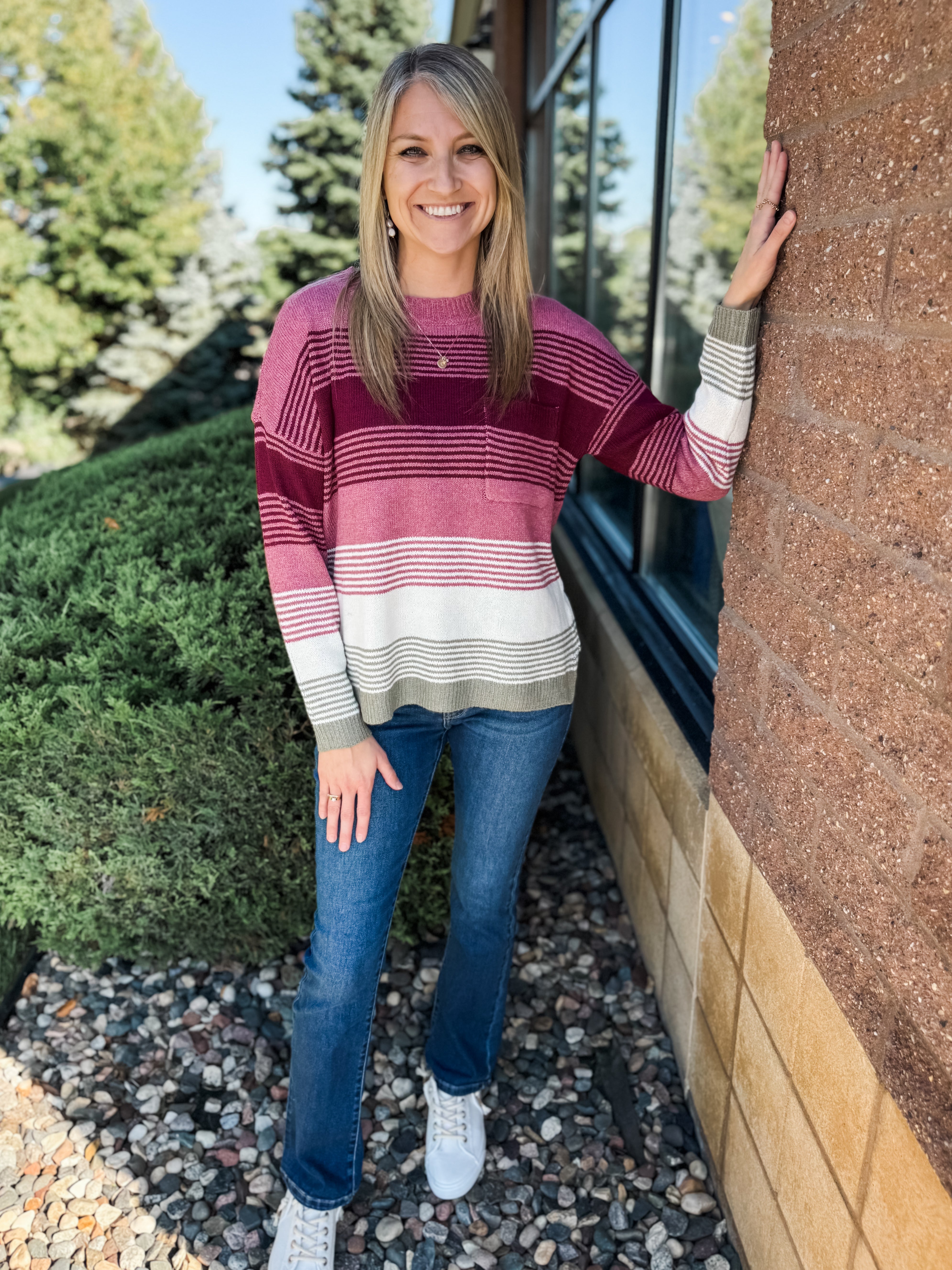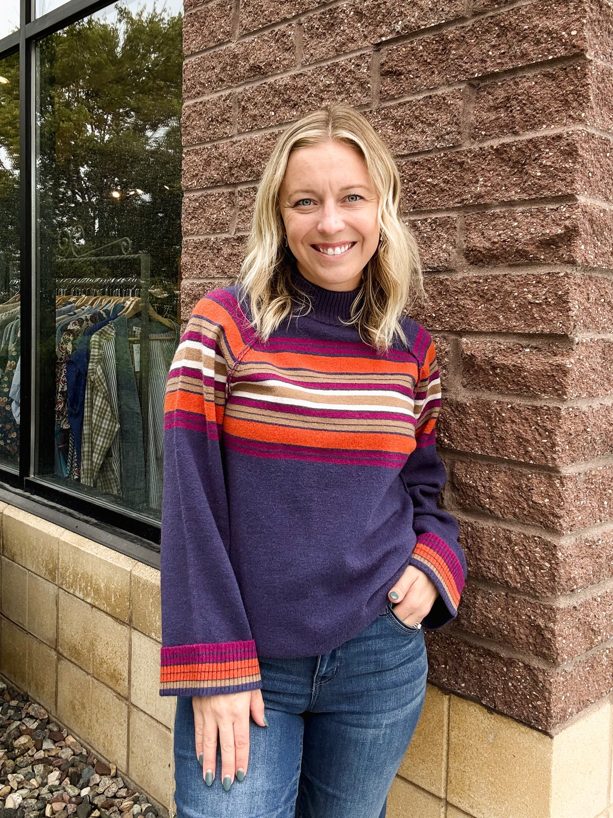 MOCK NECK PLACEMENT STRIPE BUBBLE HEM SWEATER