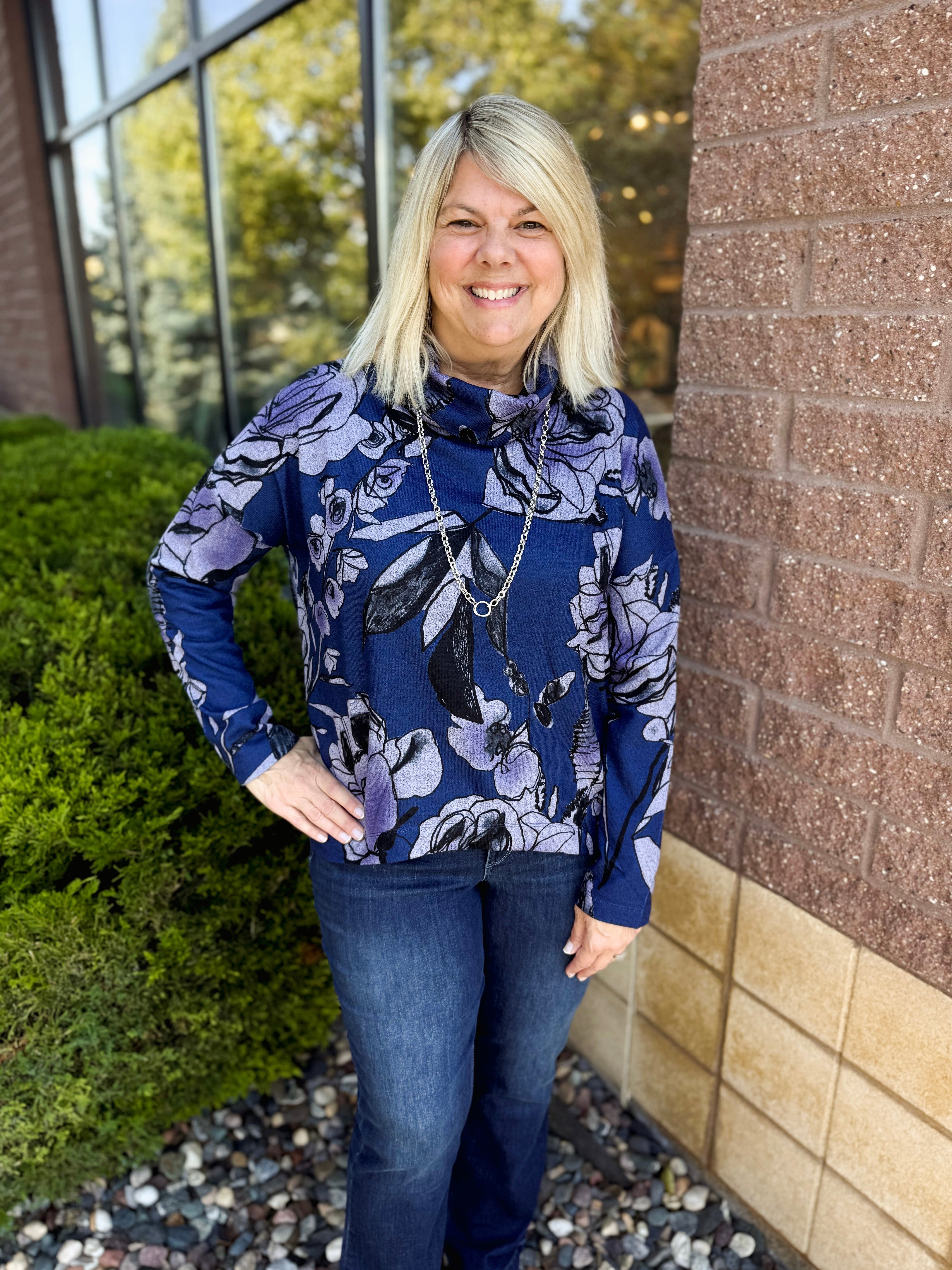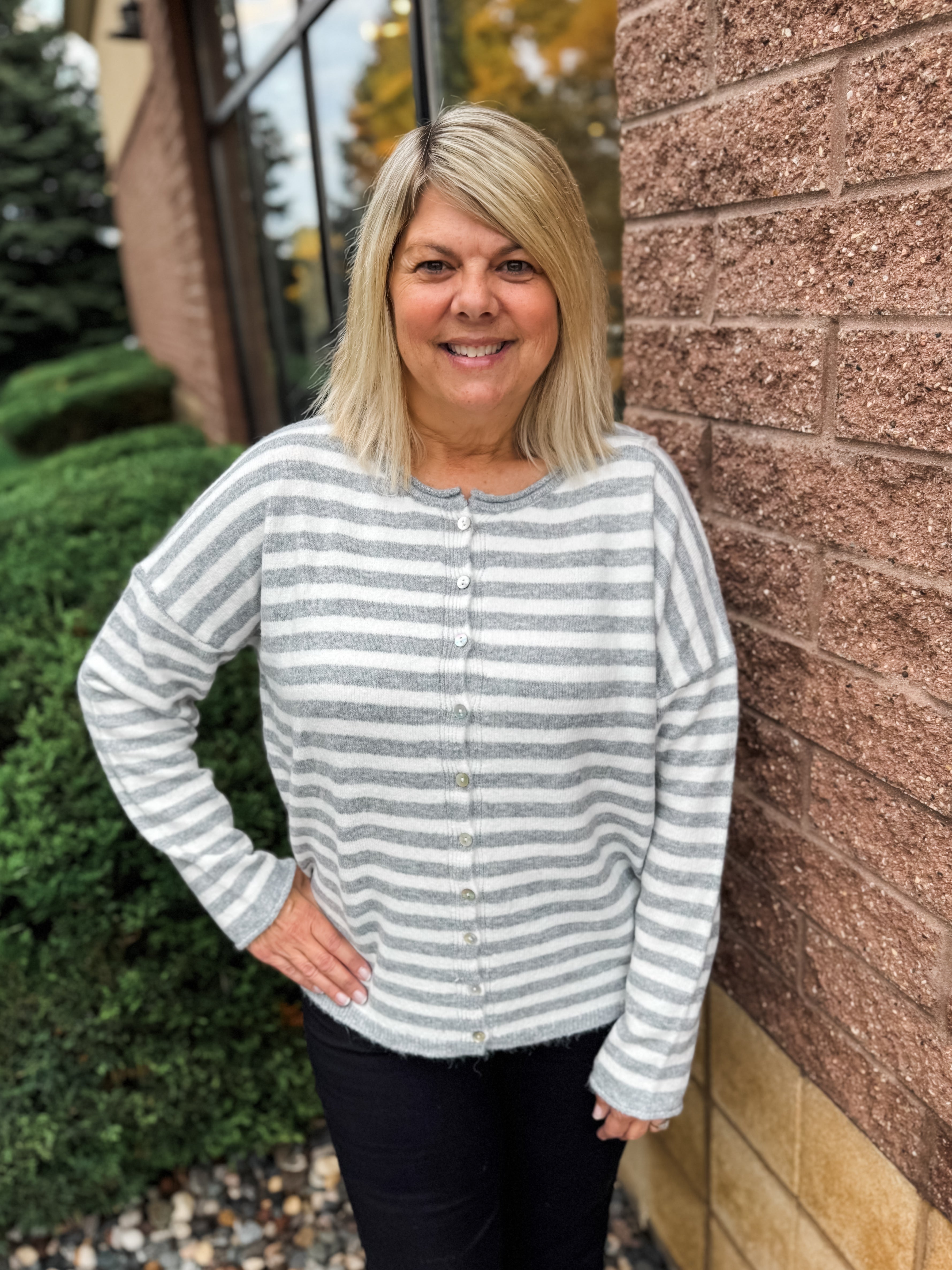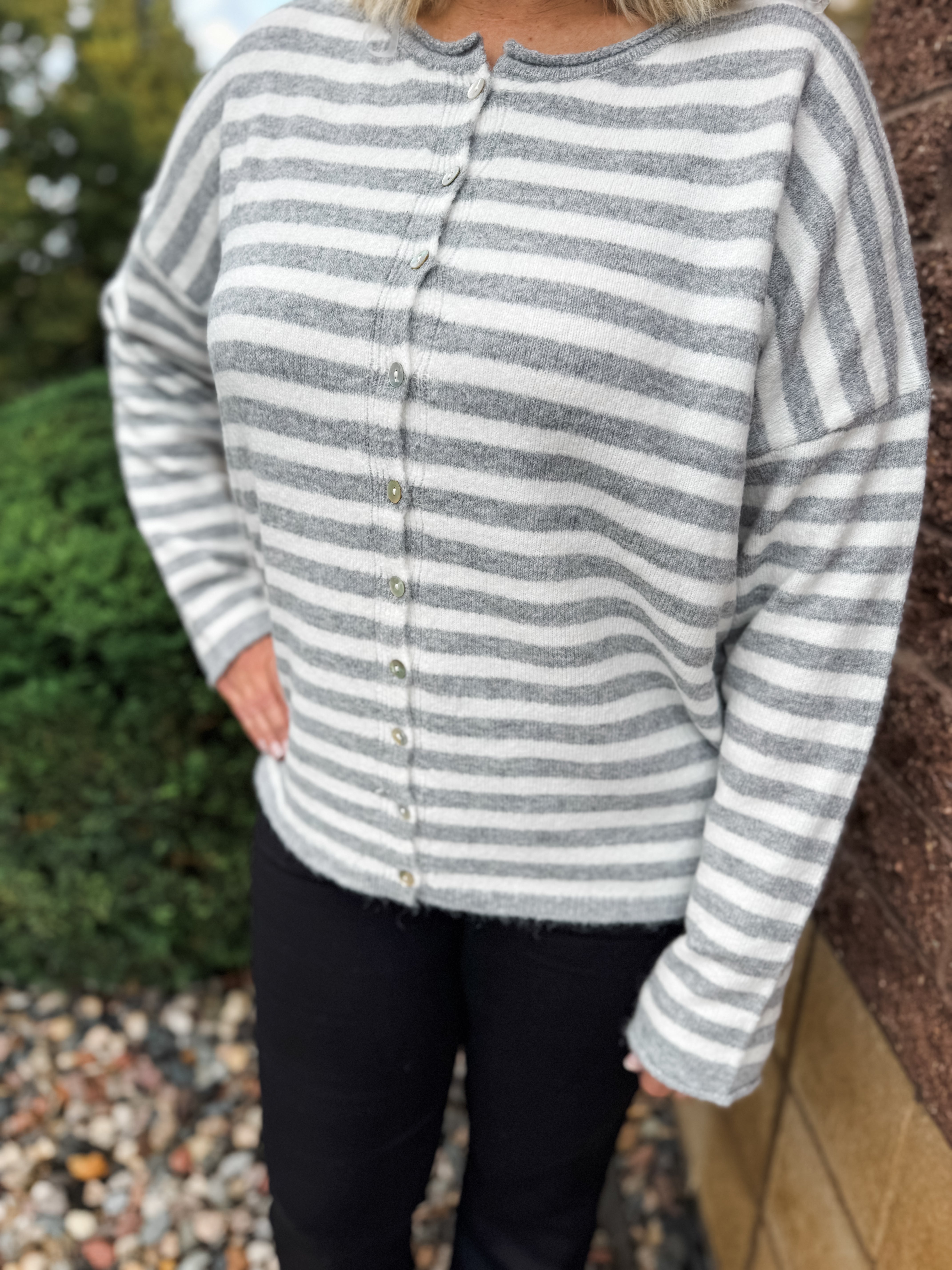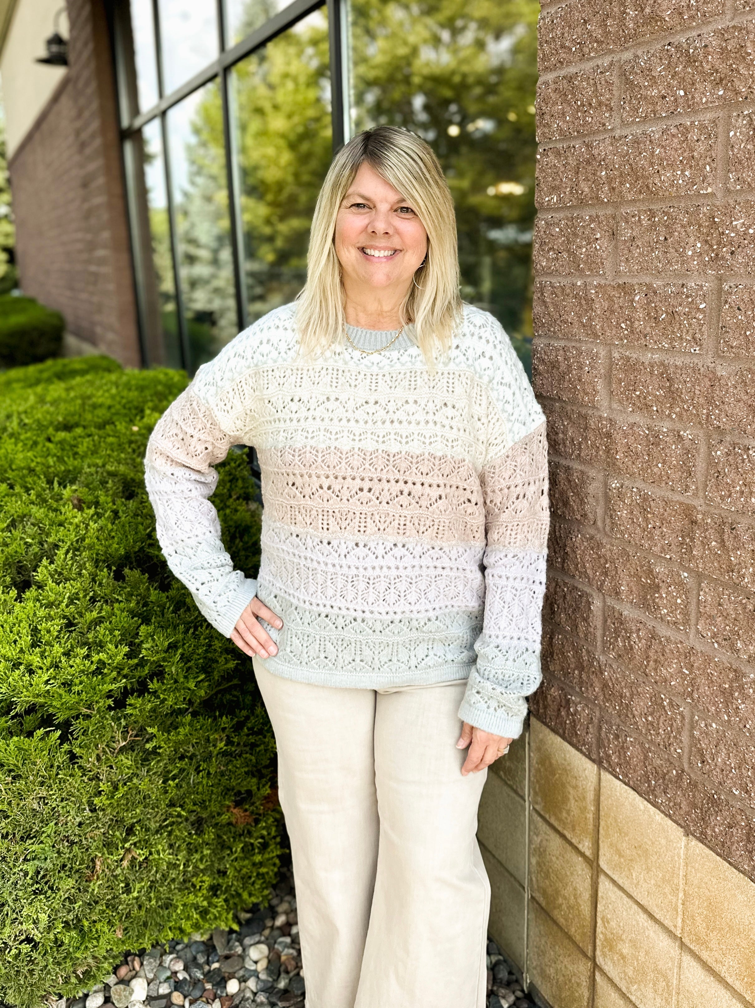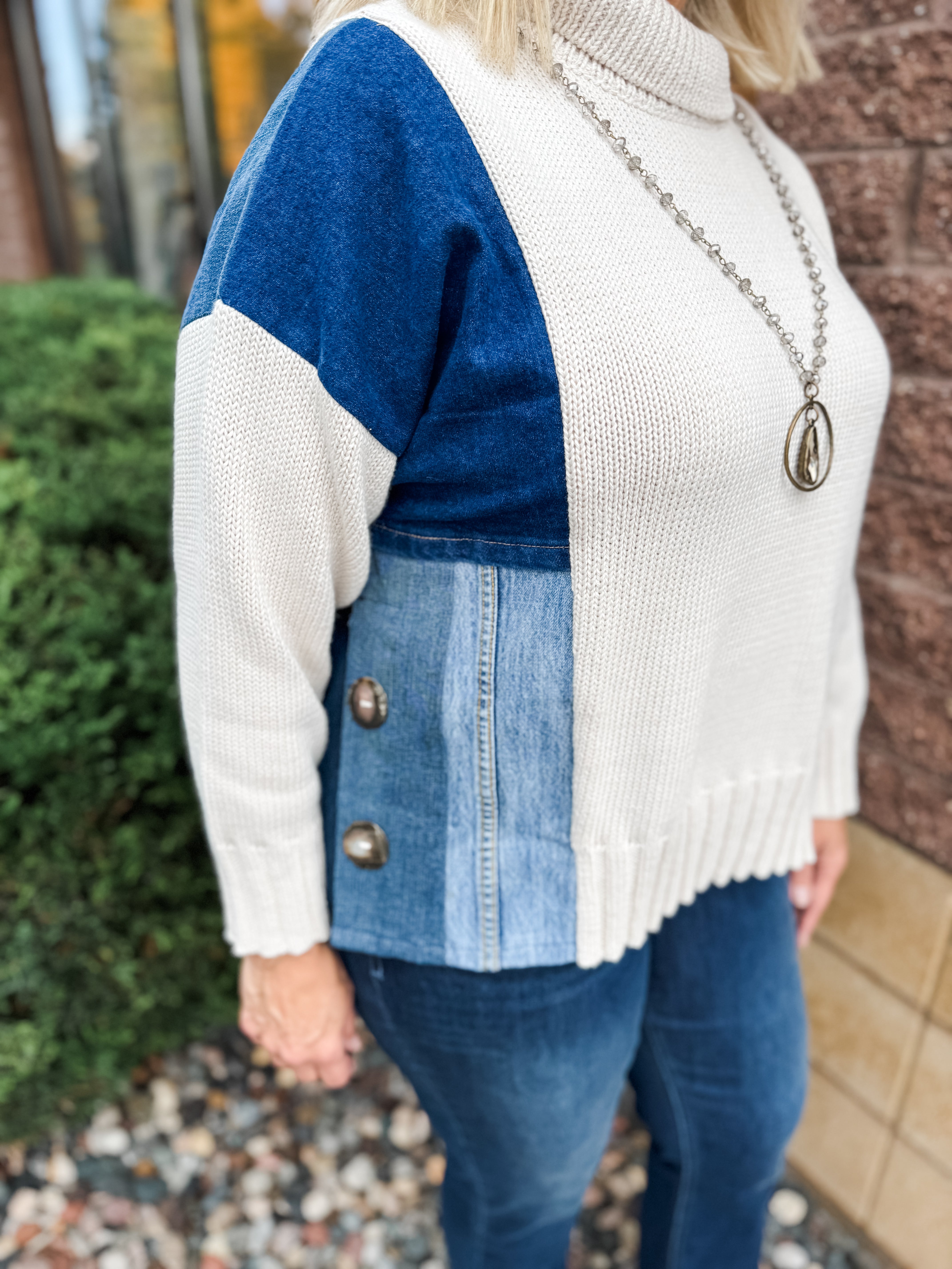 MOCK NECK PLACEMENT STRIPE BUBBLE HEM SWEATER