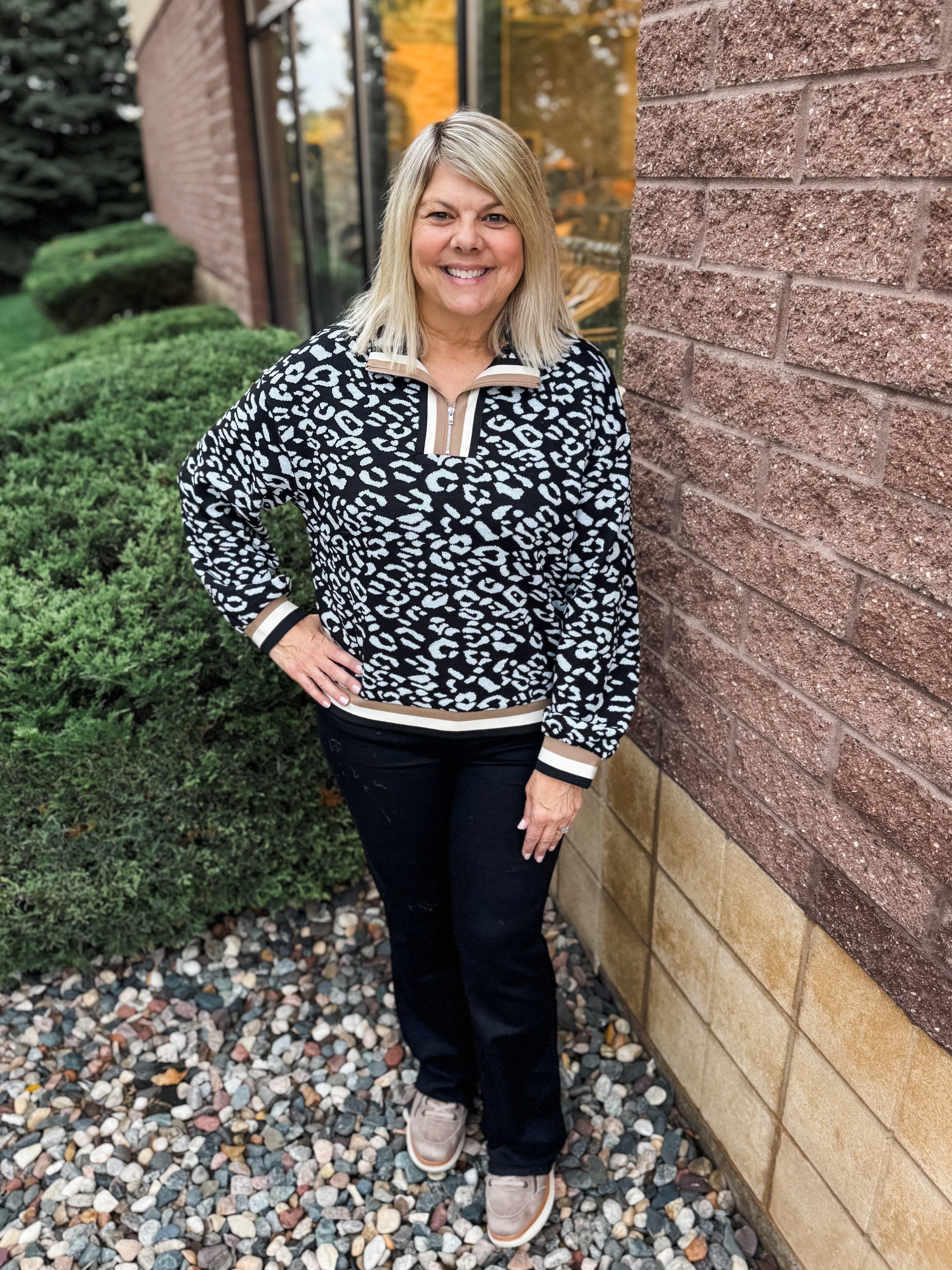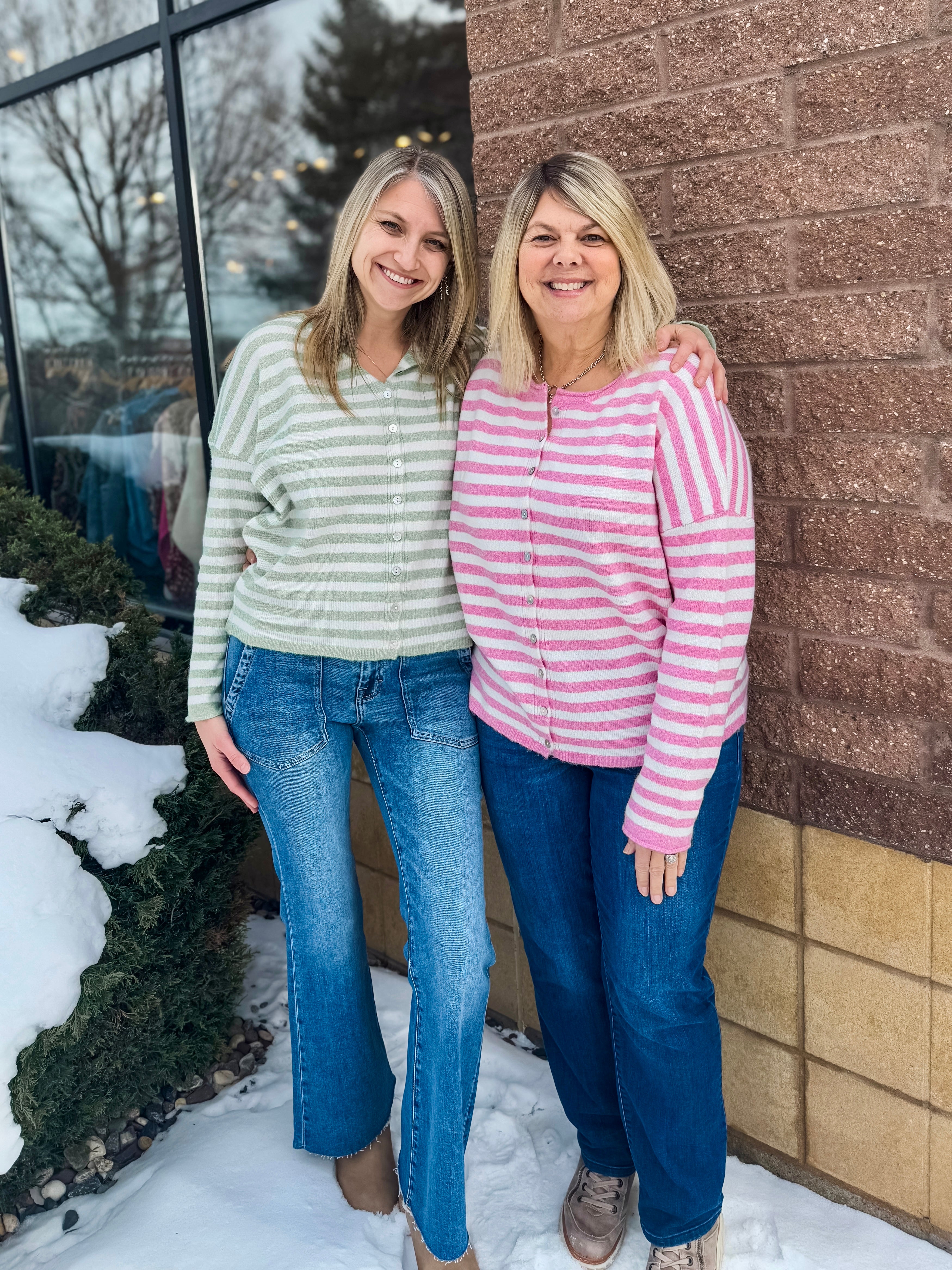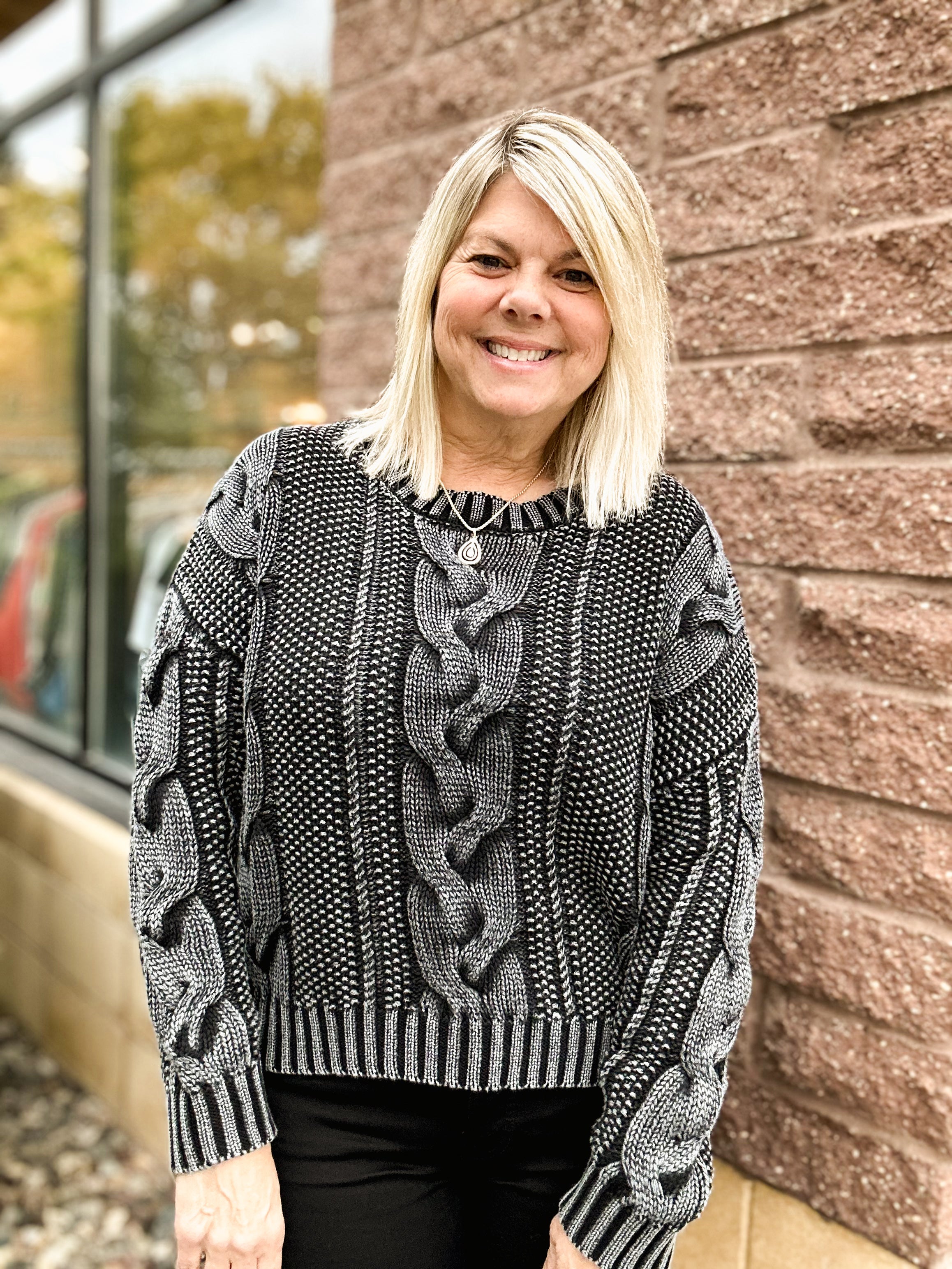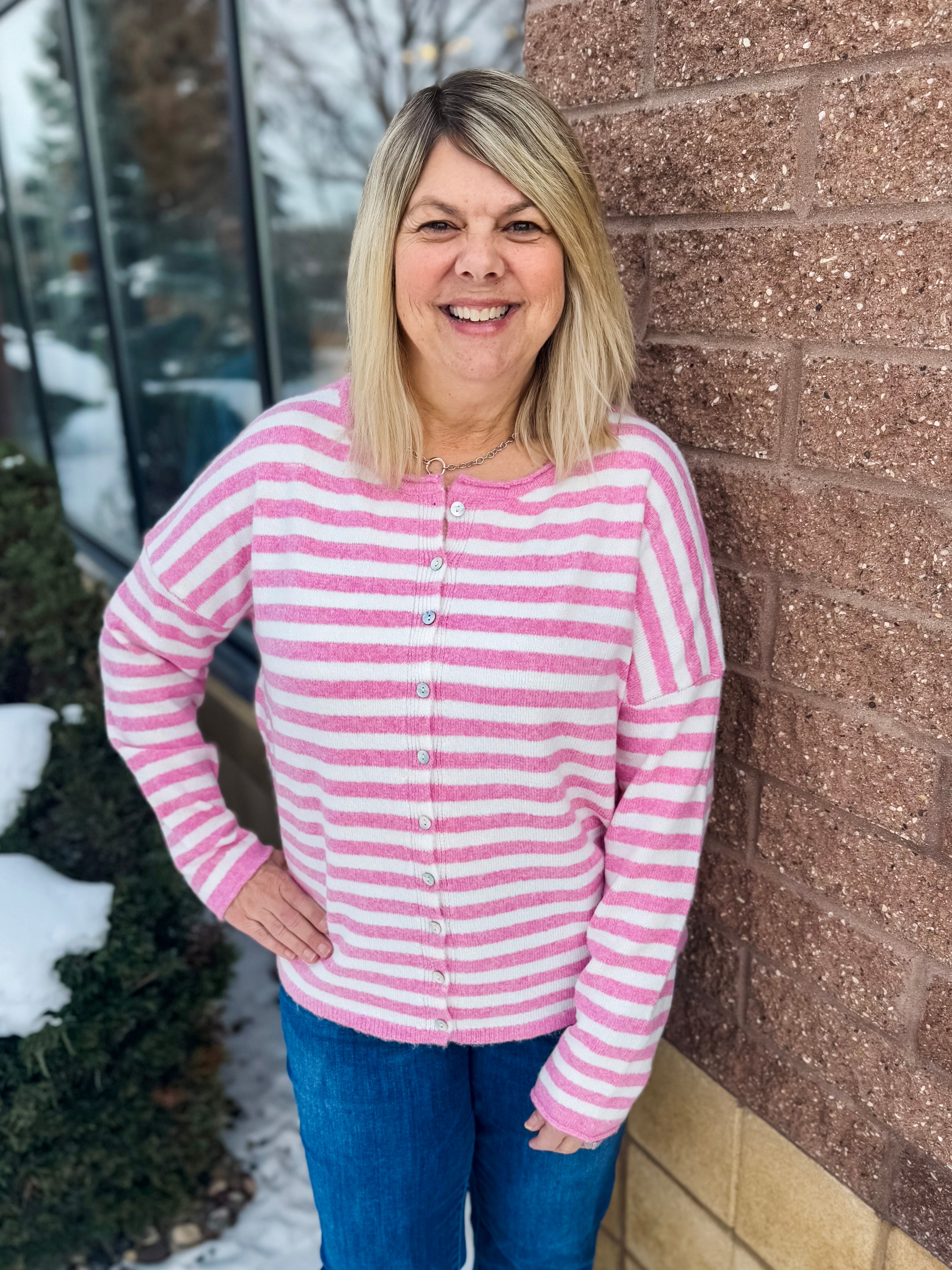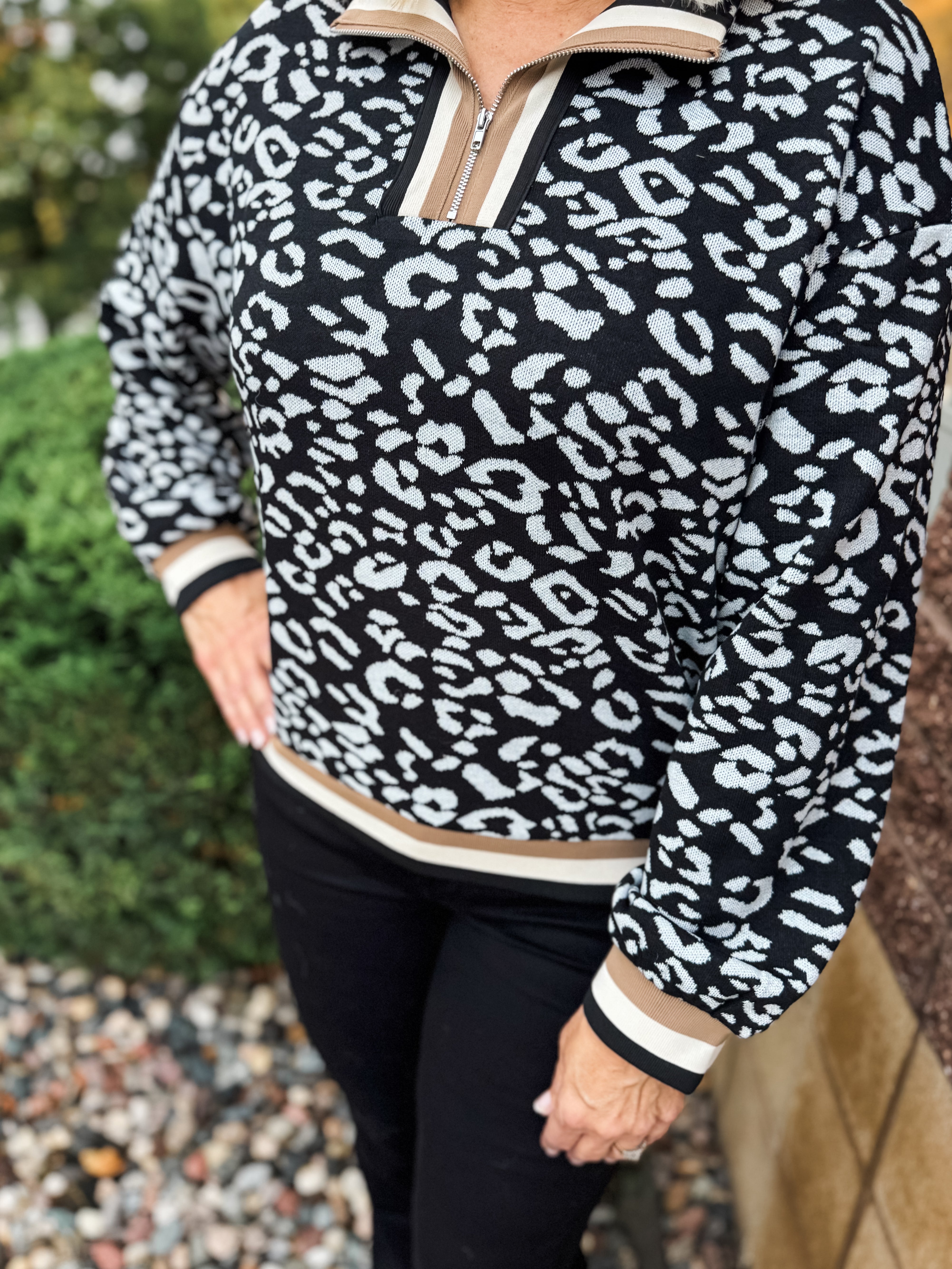 MOCK NECK PLACEMENT STRIPE BUBBLE HEM SWEATER