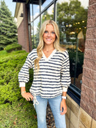 3/4 BLOUSON SLEEVE KNIT TOP WITH JACQUARD BANDS