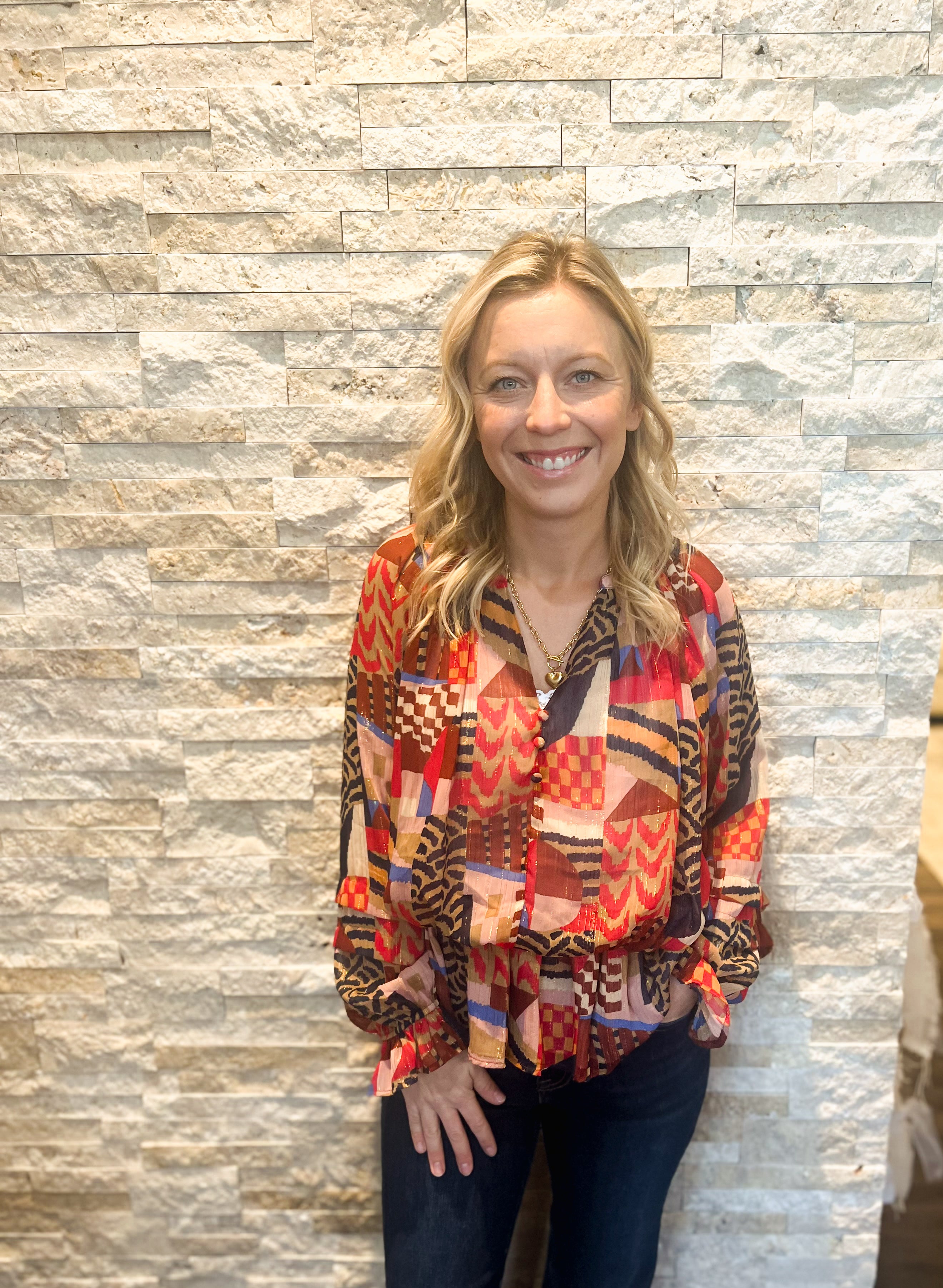 Abstract Print Lurex Chiffon Shirred Waist Blouse