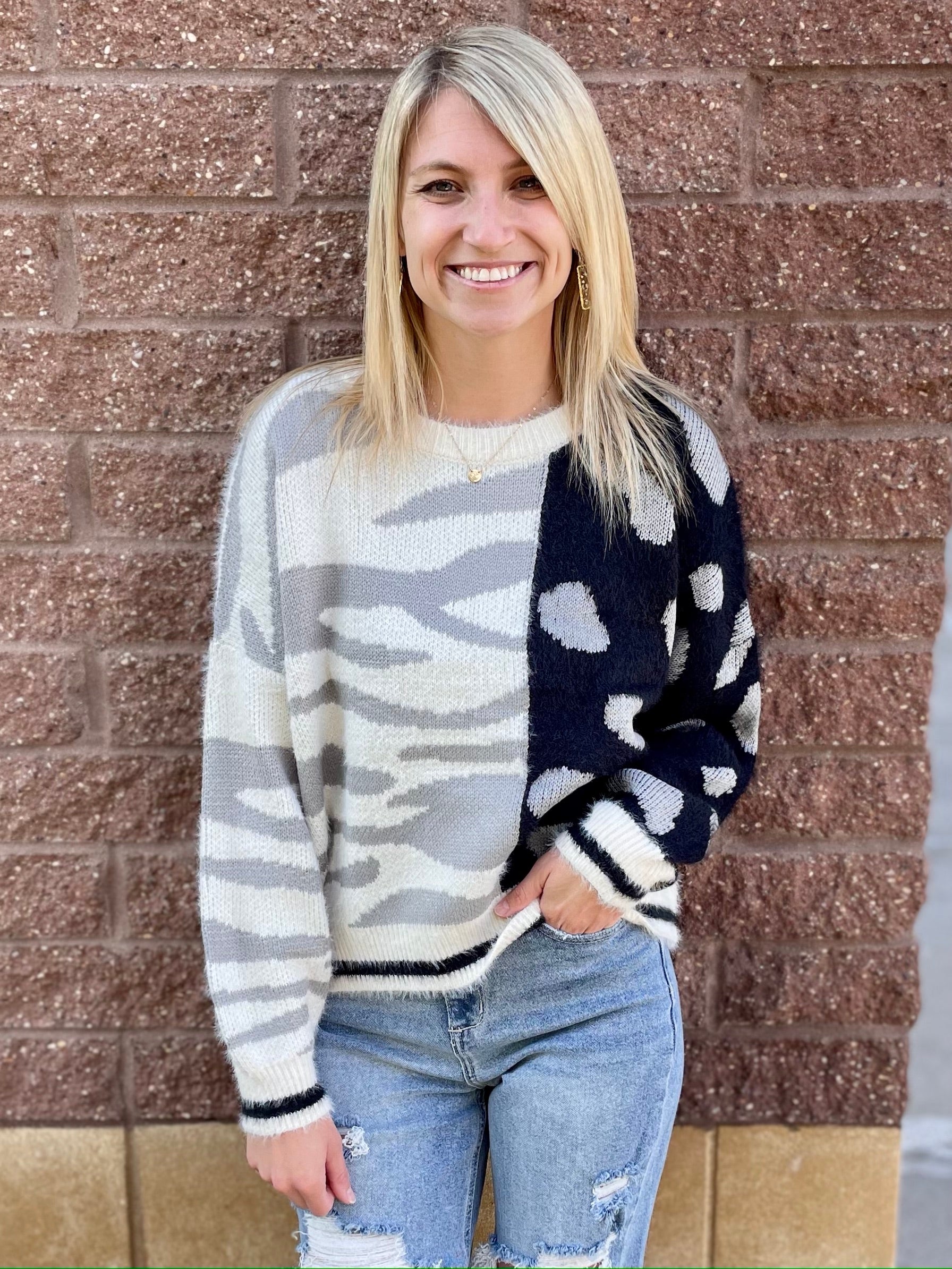 Animal Print Crewneck Sweater with Colorblocking - HQ