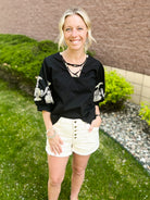 Blouson Elbow Sleeve Lace Up Embroidered Top S24 - HQ