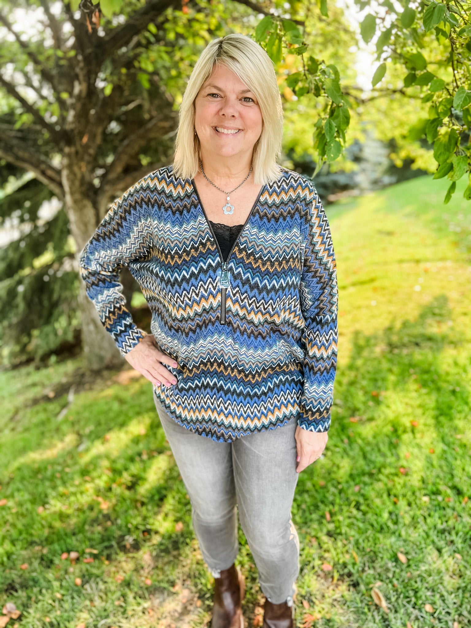 Blue Chevron Printed Dolman Sleeve Zipper Top