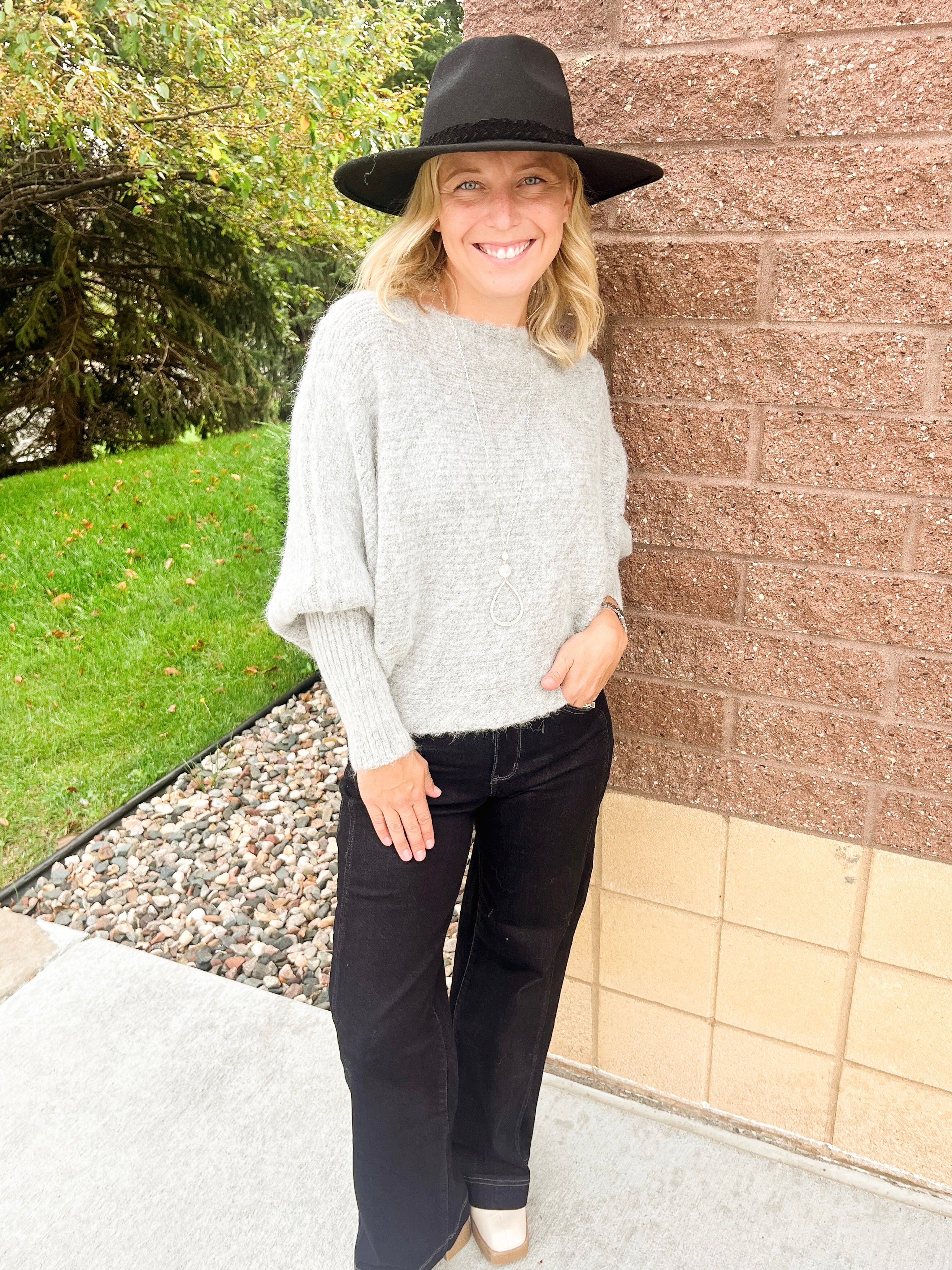 Boat Neck Dolman Sleeve Ribbed Fuzzy Knit Sweater