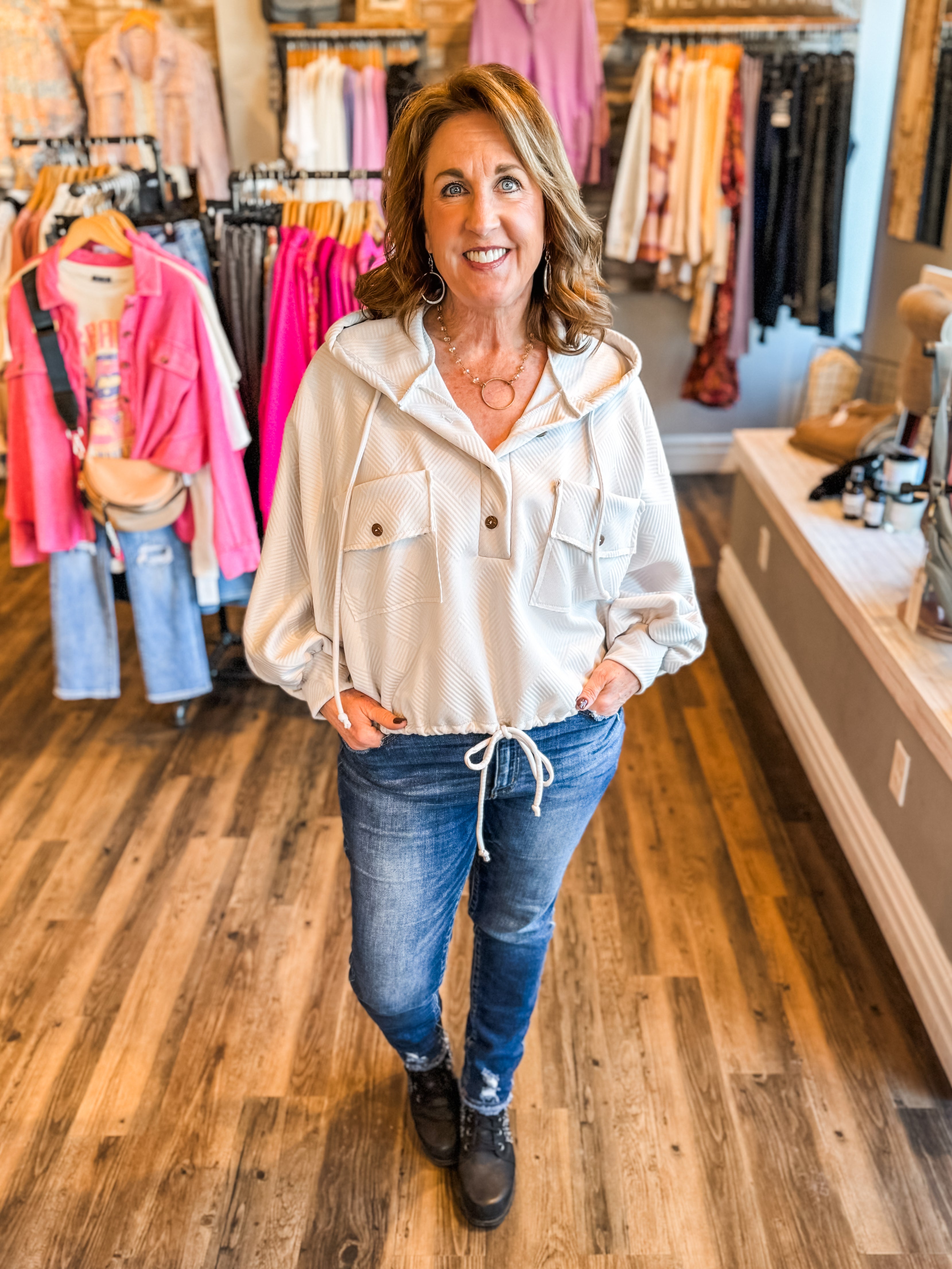 Button Up Textured Knit Hoodie With Tunnel Hem