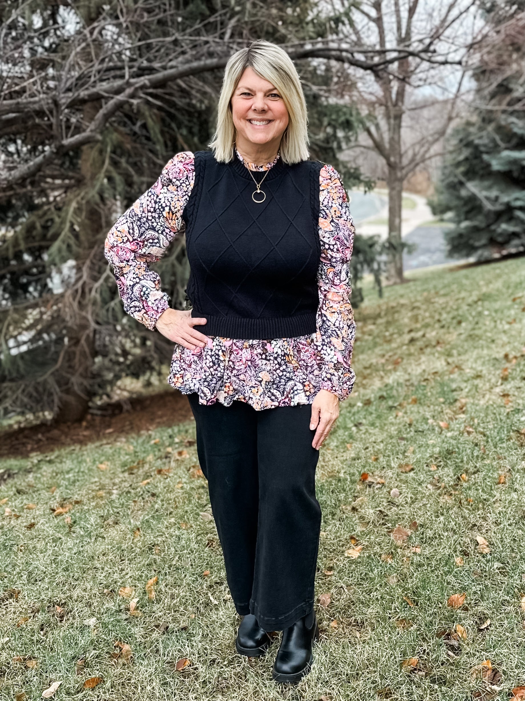 Cable Knit Contrast Floral Sleeve Peplum Sweater