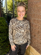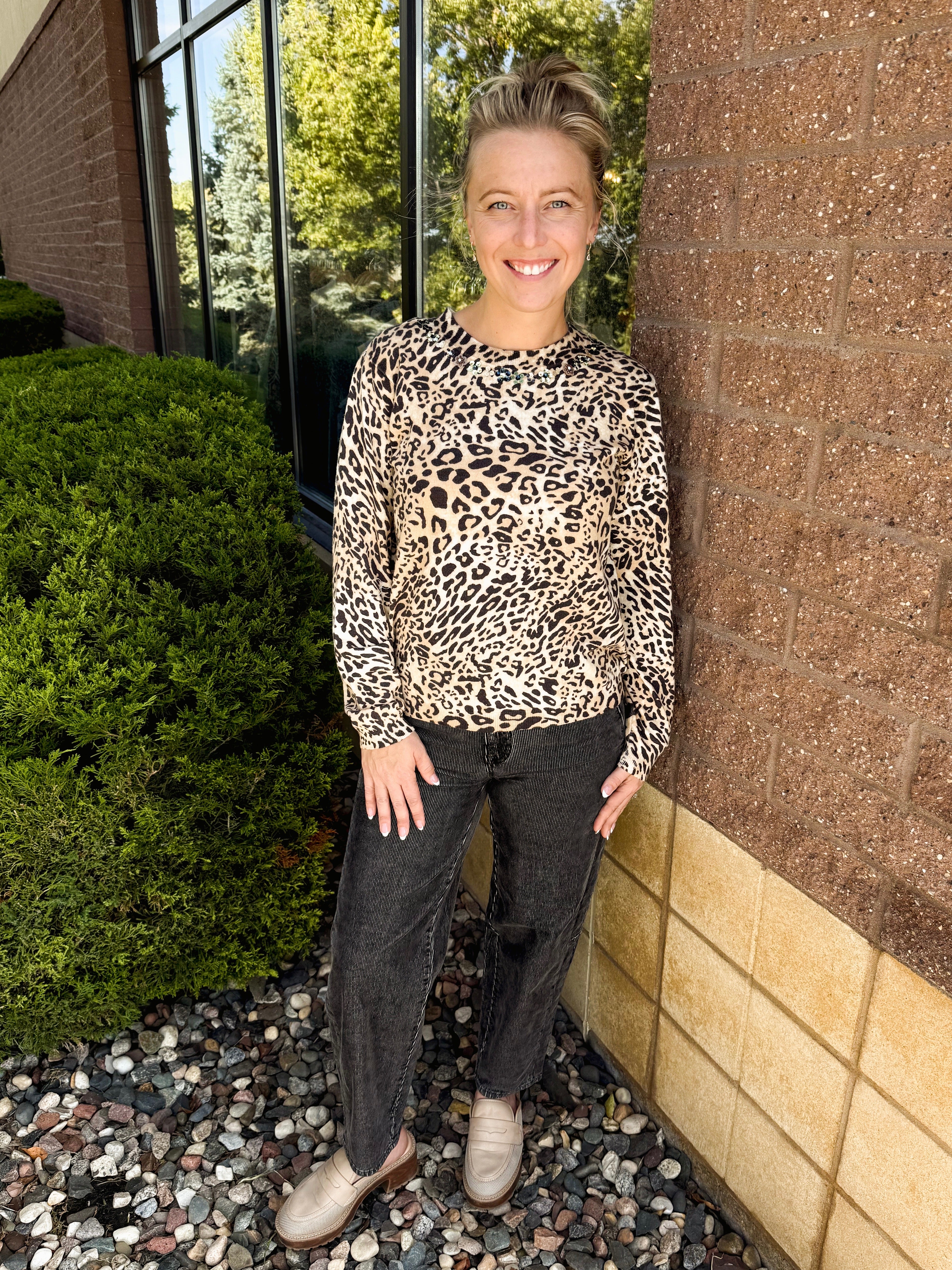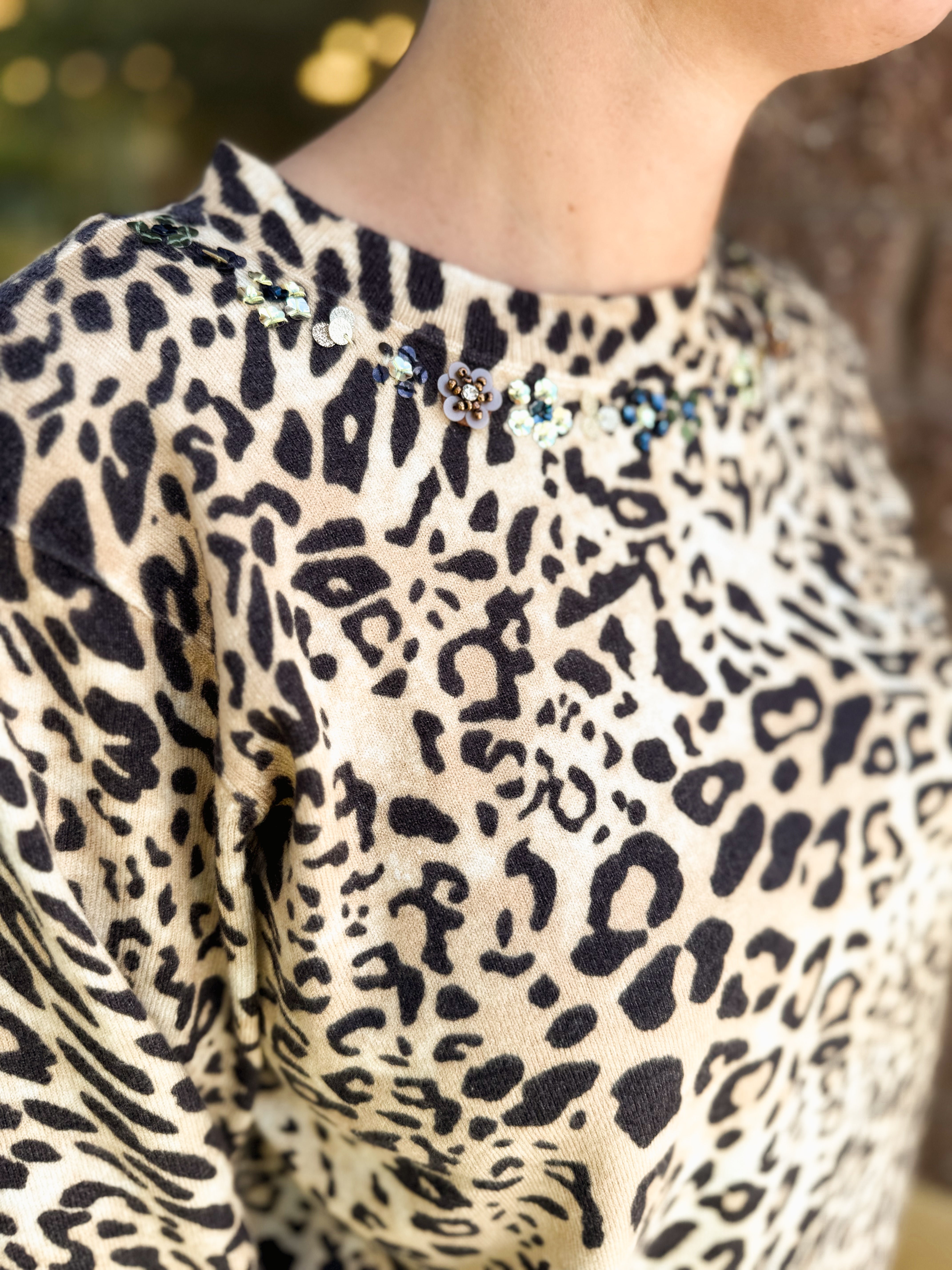 LONG SLEEVE SEQUIN EMBROIRDERY ROUND NECK PRINTED SWEATER